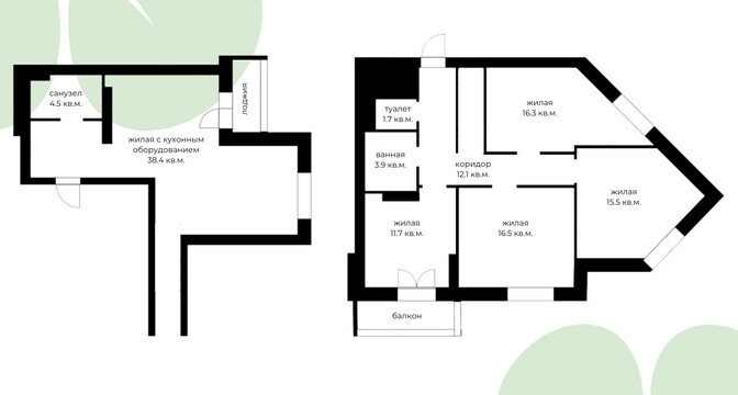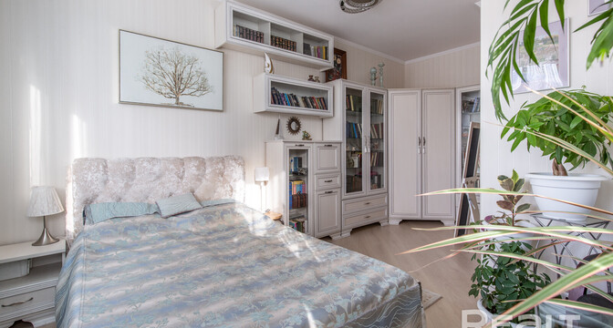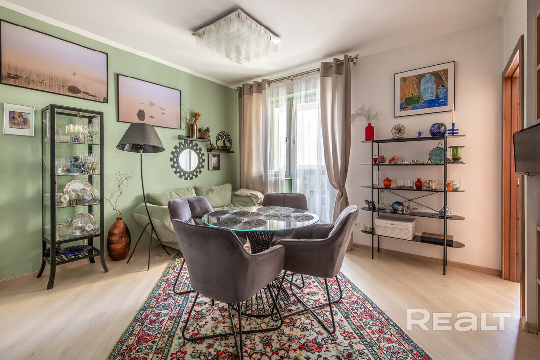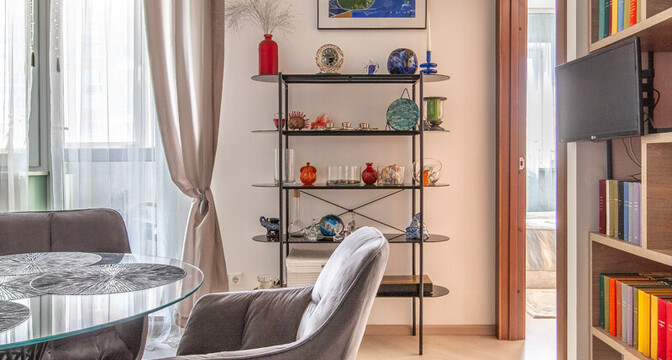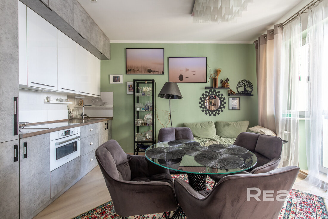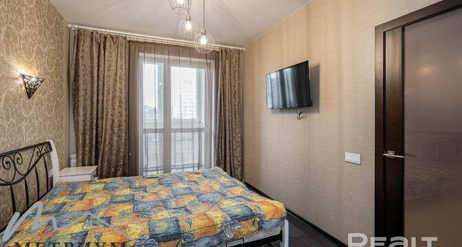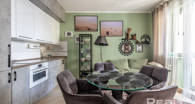 Следующий вариант — евродвушка площадью 45 квадратных метров. Это жилье находится на 9-м этаже. Уютная квартира состоит из кухни-гостиной и спальни. Интерьер выдержан преимущественно в светлой цветовой гамме с несколькими яркими акцентами. Ремонт выполнен по индивидуальному проекту. Напольное покрытие — плитка и ламинат. Из окон открывается панорамный вид на сосновый лес. Стоимость — 110 тысяч долларов (2428 долларов — за метр).