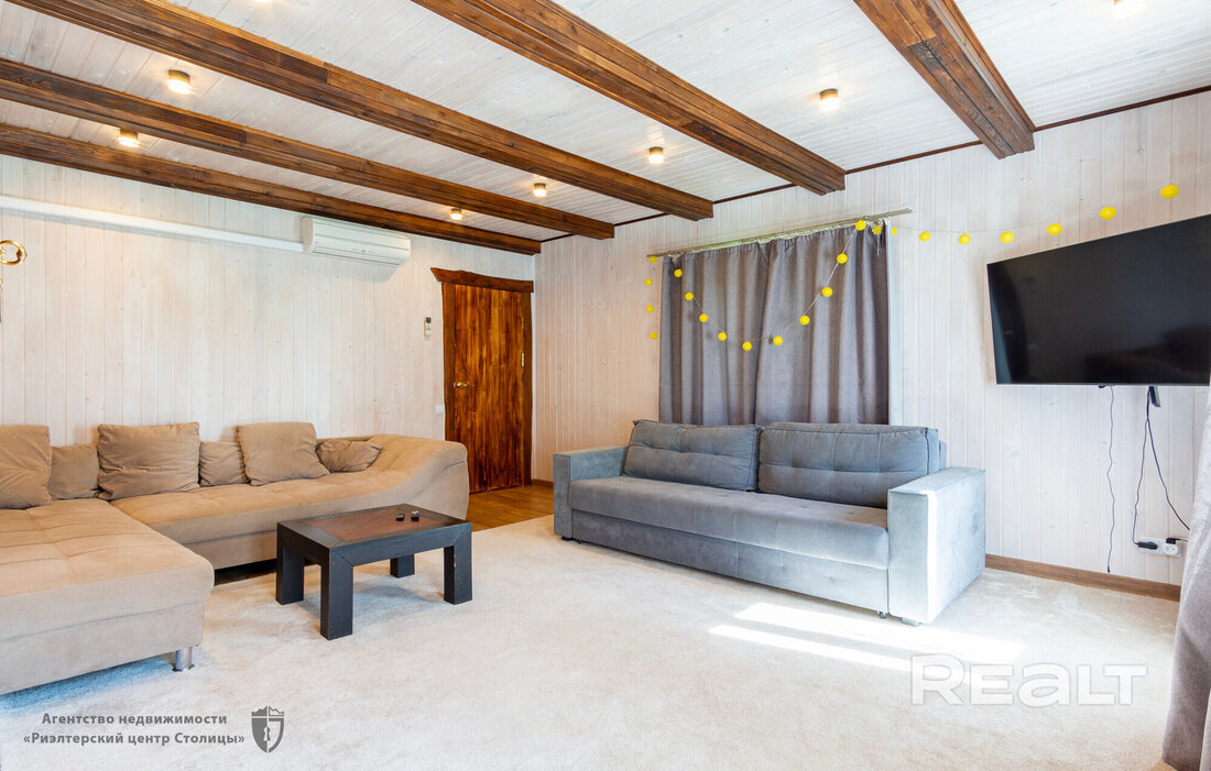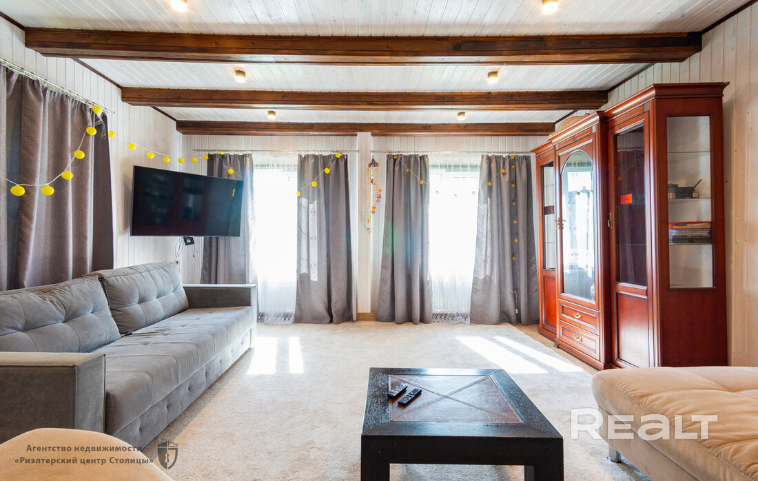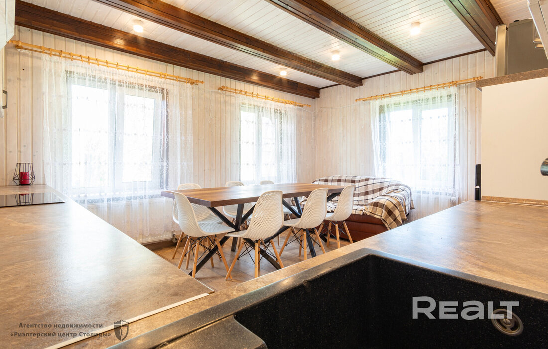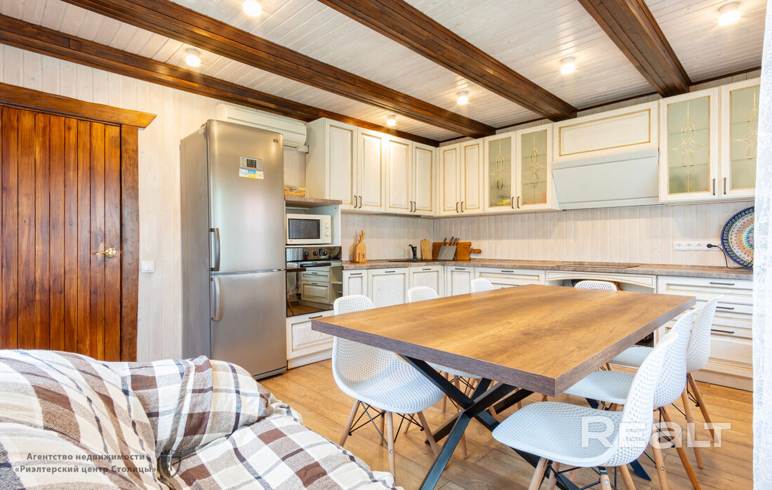Дом полностью готов к проживанию. Эффектно выглядят балки на потолке на фоне светлой отделки стен и потолка деревом. На первом этаже разместилась отдельная кухня со столовой зоной. Здесь имеется вся необходимая техника.