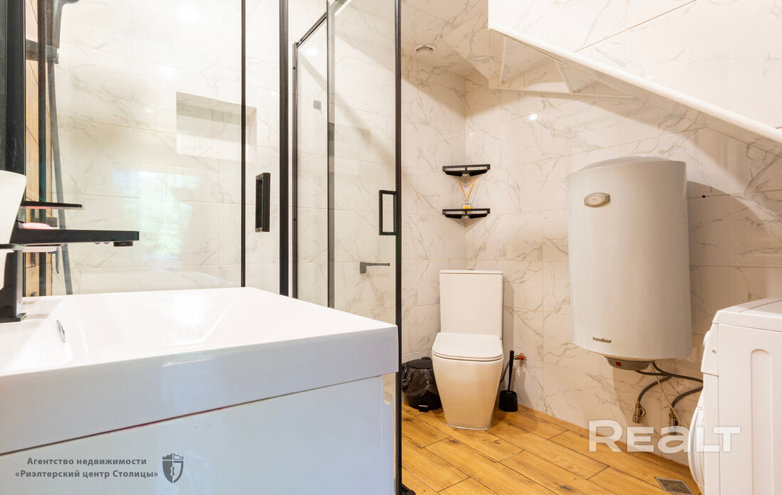 В доме обустроен и совмещенный санузел. Там сделана душевая кабина, висит бойлер. Отопление здесь электрическое, канализация — местная, а вода поступает по центральному водопроводу.