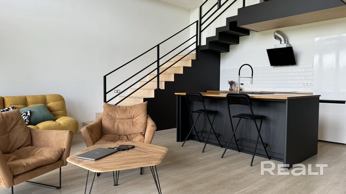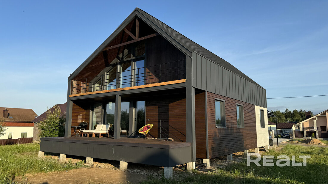 Двухуровневый барнхаус в 154,6 м² построили в деревне Галица в Логойском районе в 2021 году. Фундамент — свайный железобетонный. Стены тут утеплены минватой, на крыше лежит фальцевая кровля. Под кровлю и пол использовали клееные двутавровые балки высотой 400 мм.