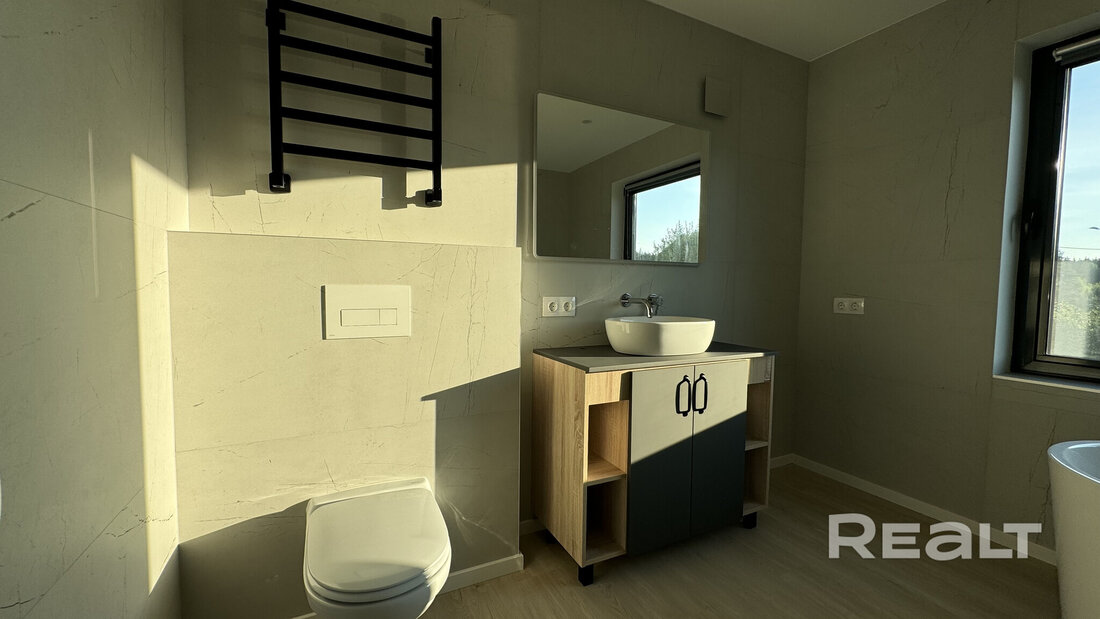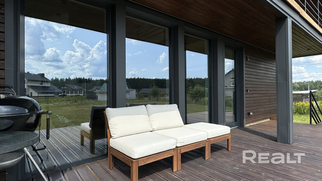 Нашли хороший дом с ремонтом и коммуникациями. Внутри все сделано на современный лад: терраса, гостиная с панорамными окнами, второй свет, есть даже мастер-спальня с гардеробной и отдельным санузлом. Из ванны, кстати, открывается вид на участок. Стоит жилье недешево, но и локация непростая — деревня в Логойском районе и в 17 км от Минска. Оцените дом сами и сравните со стоимостью.
