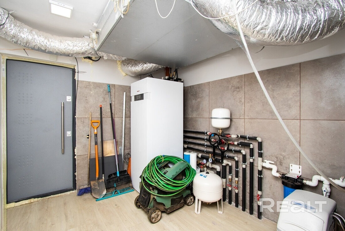 В доме имеется котельная с отдельным входом. Отопление идет через грунтовой тепловой насос со встроенным бойлером (можно подвести газ). Помогает и водяной теплый пол. Вода поступает из скважины, установлена очистка воды по всему дому. Канализация — септик. Продумана и система вентиляции с рекуперацией, работает центральный кондиционер. Также все можно подключить к системе «умный дом».