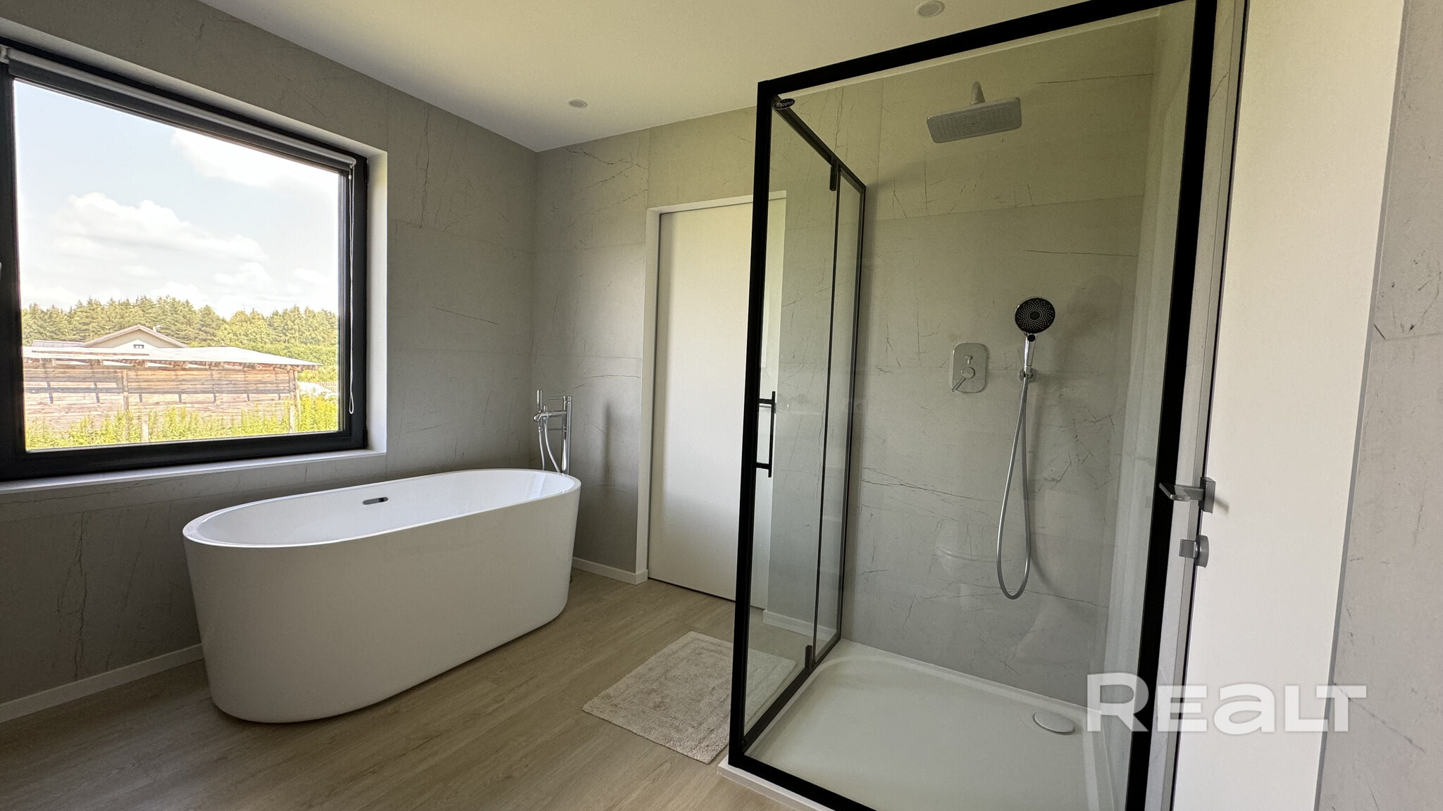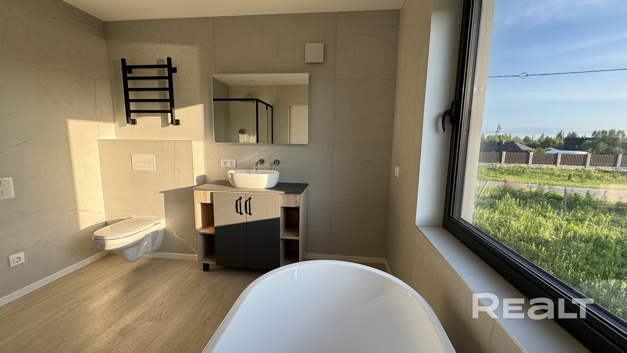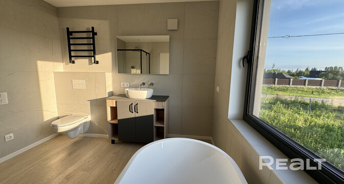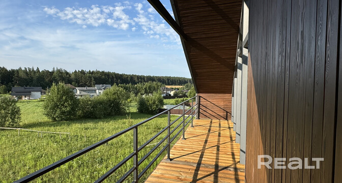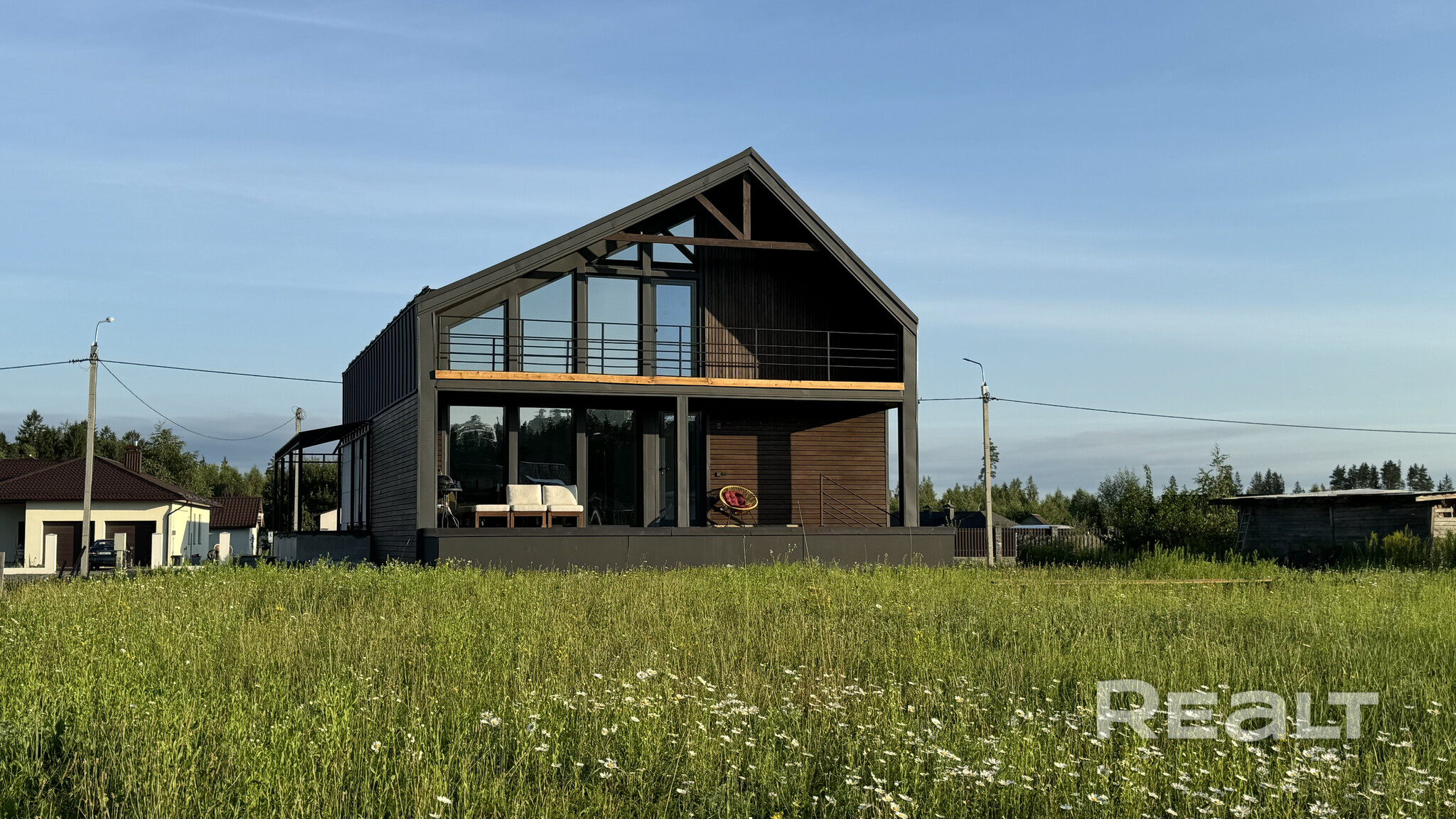 Нашли хороший дом с ремонтом и коммуникациями. Внутри все сделано на современный лад: терраса, гостиная с панорамными окнами, второй свет, есть даже мастер-спальня с гардеробной и отдельным санузлом. Из ванны, кстати, открывается вид на участок. Стоит жилье недешево, но и локация непростая — деревня в Логойском районе и в 17 км от Минска. Оцените дом сами и сравните со стоимостью.