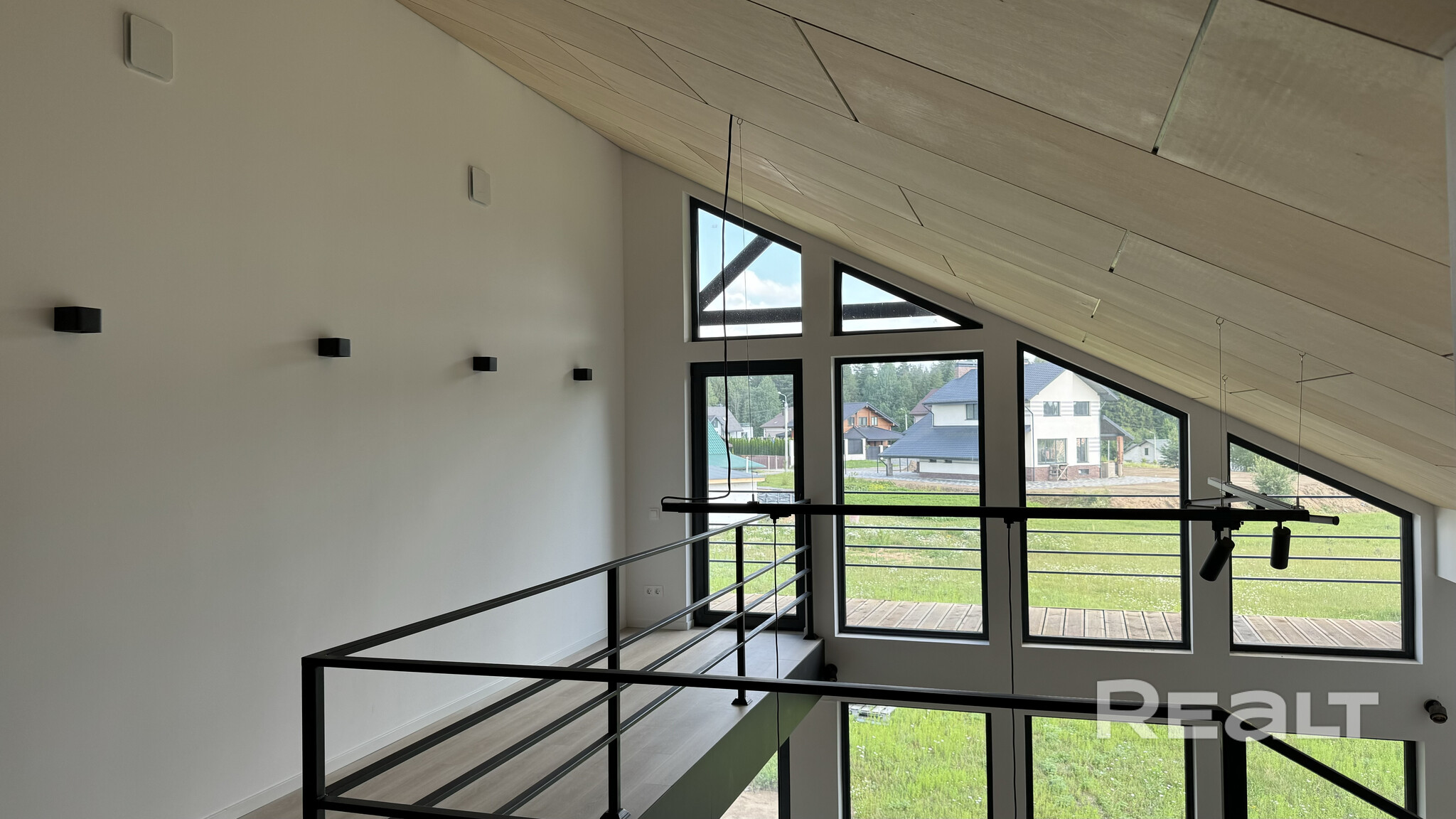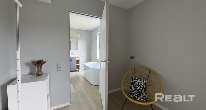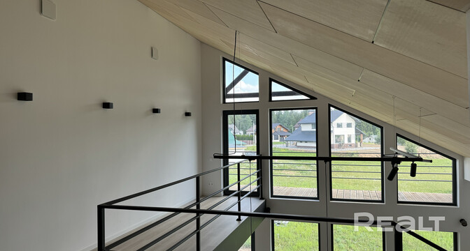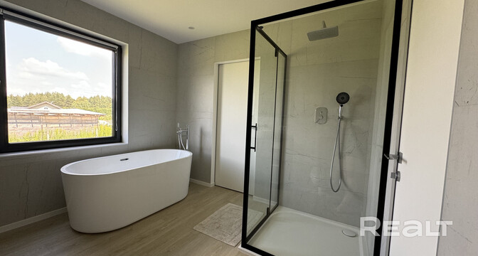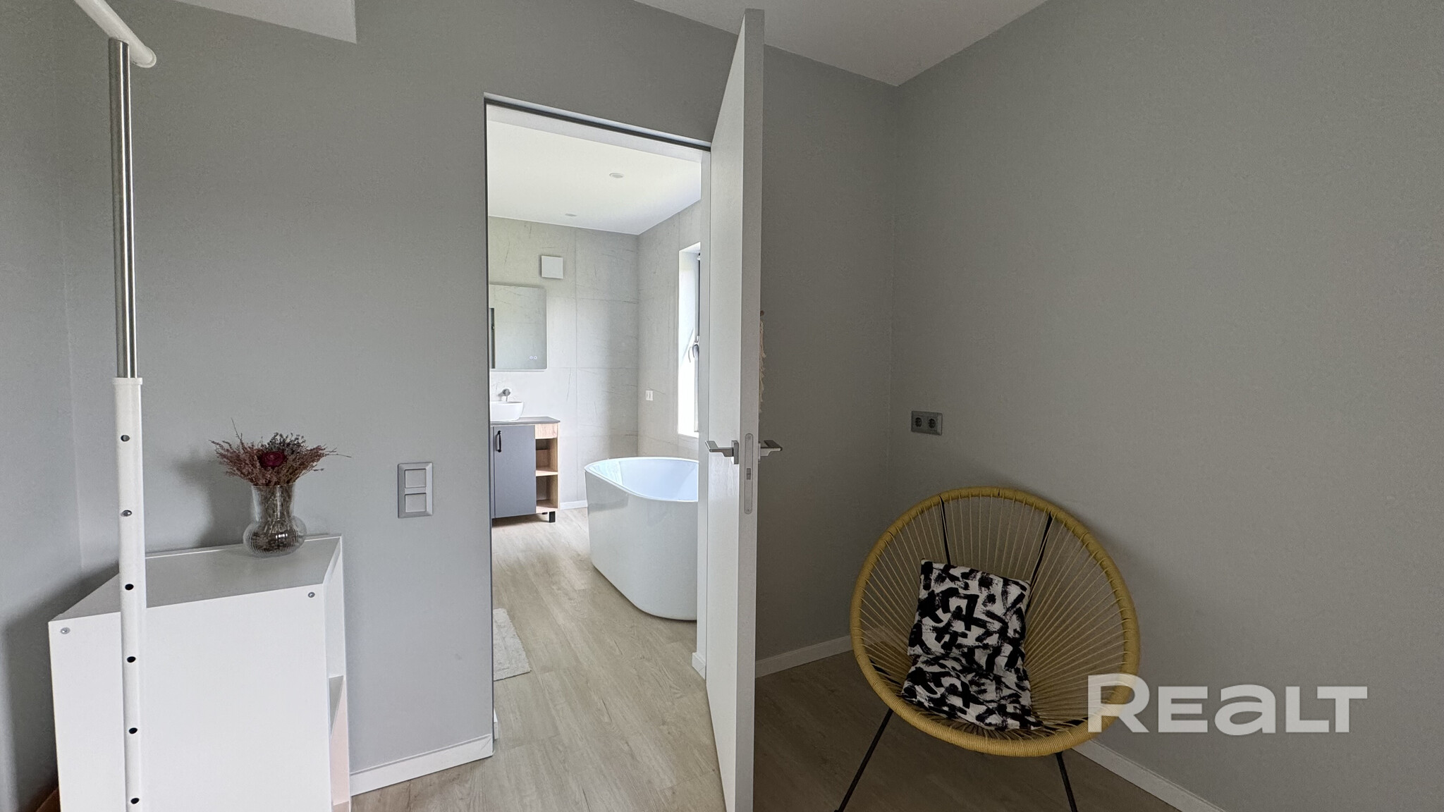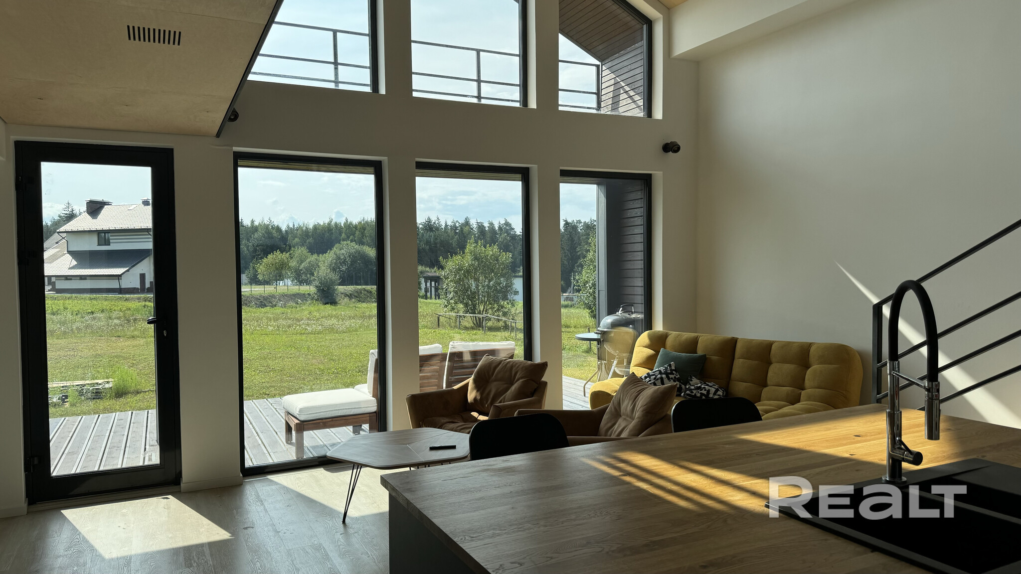 Нашли хороший дом с ремонтом и коммуникациями. Внутри все сделано на современный лад: терраса, гостиная с панорамными окнами, второй свет, есть даже мастер-спальня с гардеробной и отдельным санузлом. Из ванны, кстати, открывается вид на участок. Стоит жилье недешево, но и локация непростая — деревня в Логойском районе и в 17 км от Минска. Оцените дом сами и сравните со стоимостью.