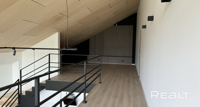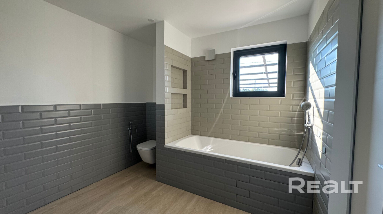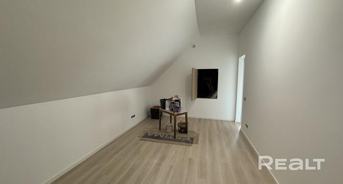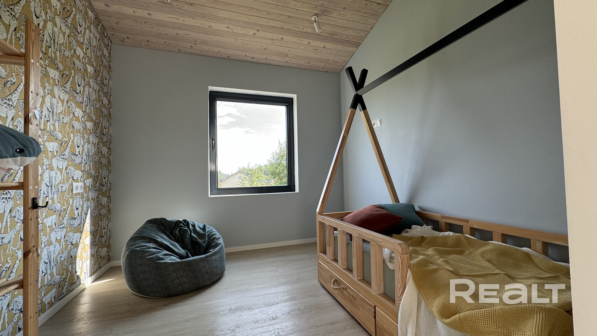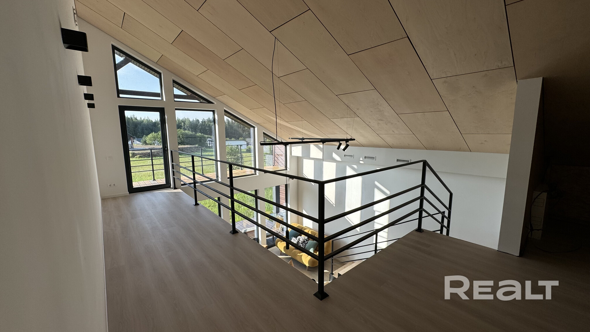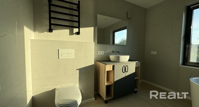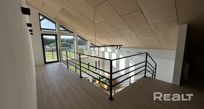 Нашли хороший дом с ремонтом и коммуникациями. Внутри все сделано на современный лад: терраса, гостиная с панорамными окнами, второй свет, есть даже мастер-спальня с гардеробной и отдельным санузлом. Из ванны, кстати, открывается вид на участок. Стоит жилье недешево, но и локация непростая — деревня в Логойском районе и в 17 км от Минска. Оцените дом сами и сравните со стоимостью.