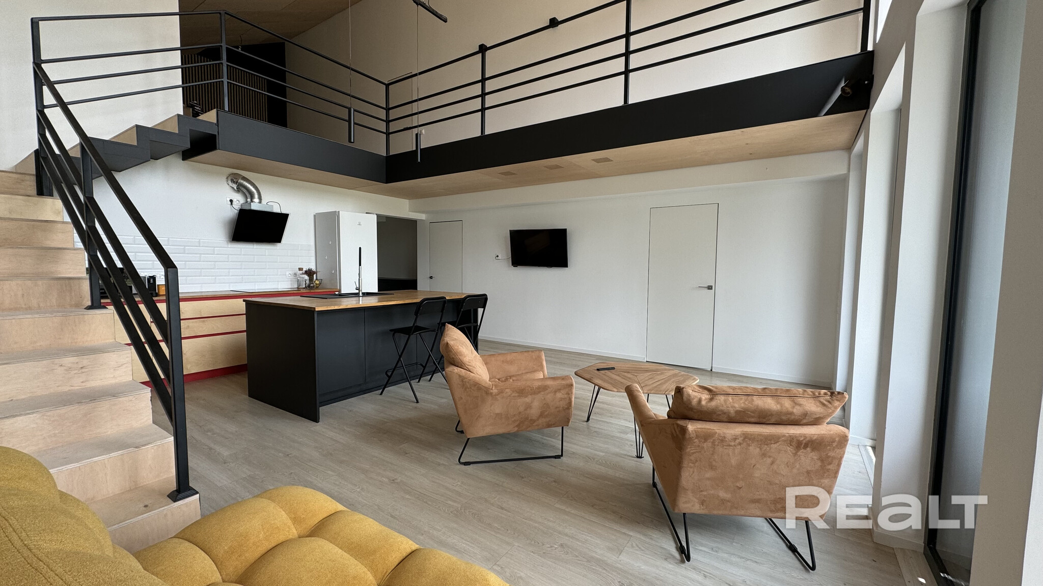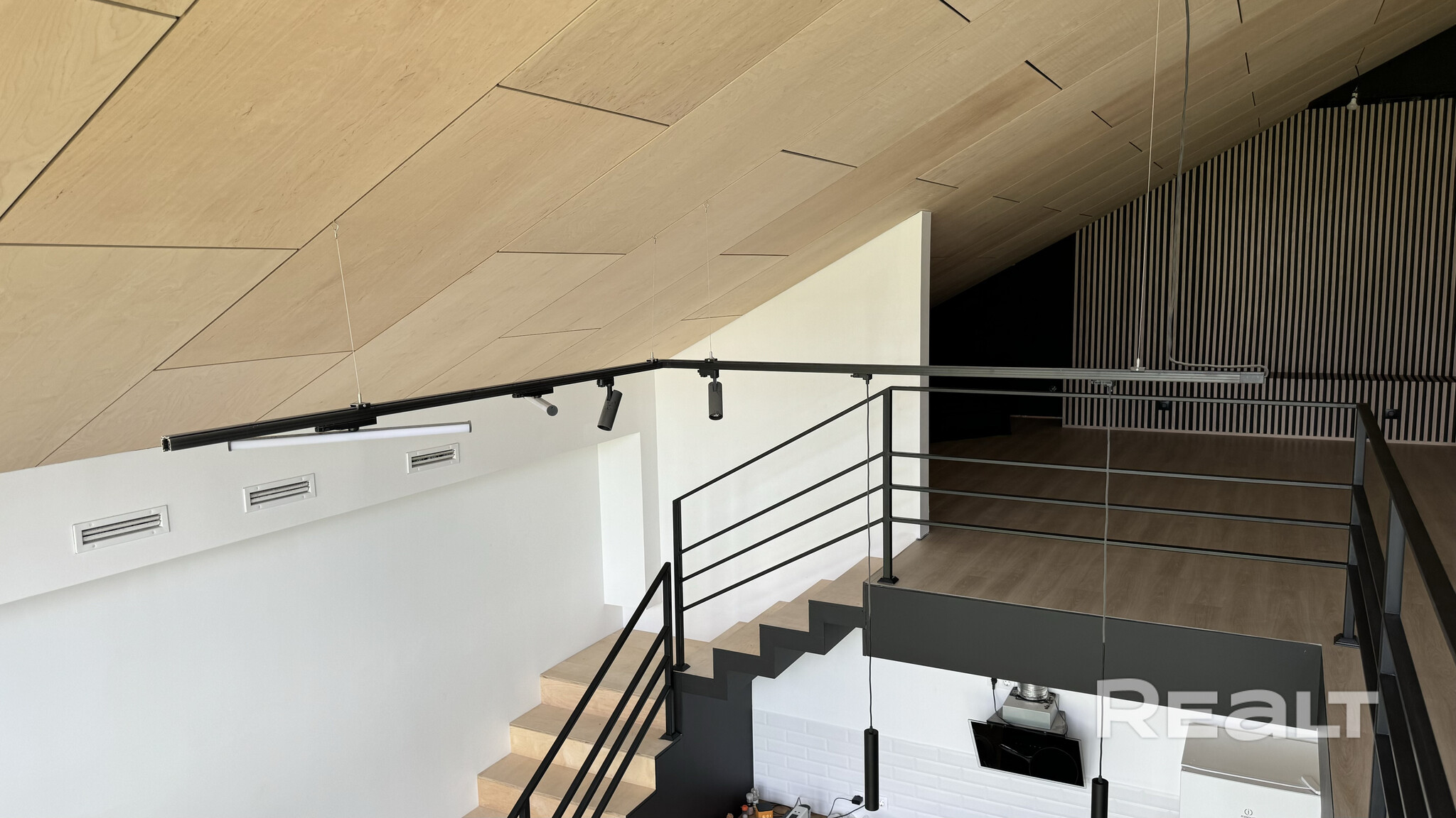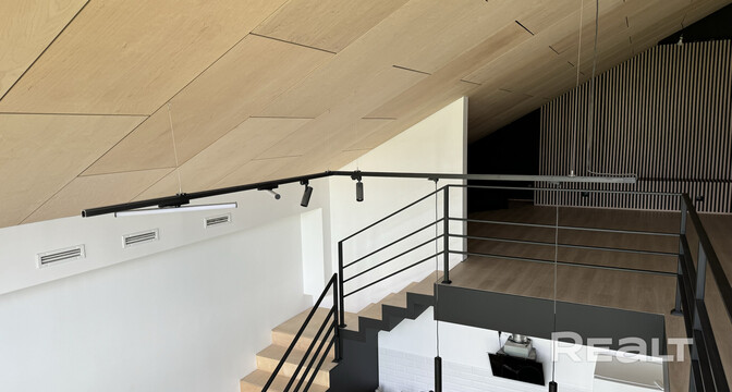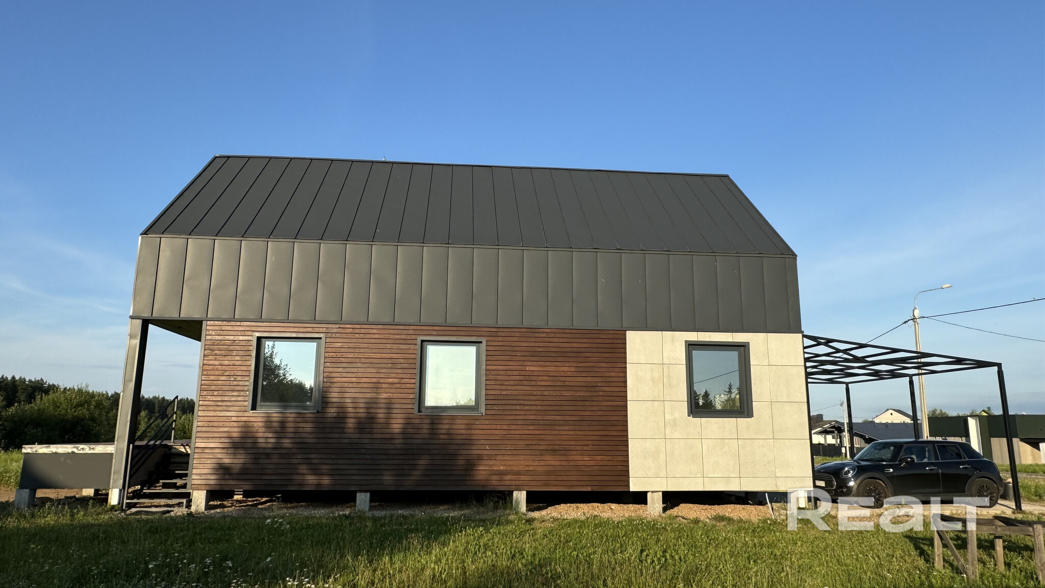 Двухуровневый барнхаус в 154,6 м² построили в деревне Галица в Логойском районе в 2021 году. Фундамент — свайный железобетонный. Стены тут утеплены минватой, на крыше лежит фальцевая кровля. Под кровлю и пол использовали клееные двутавровые балки высотой 400 мм.