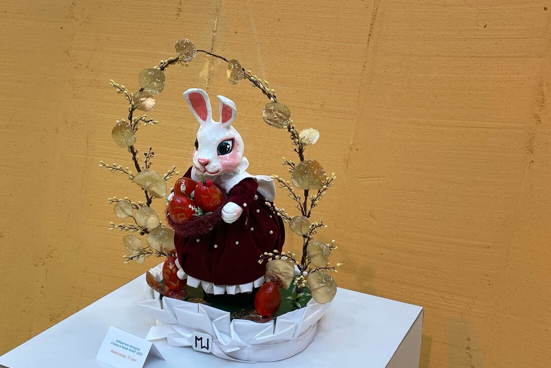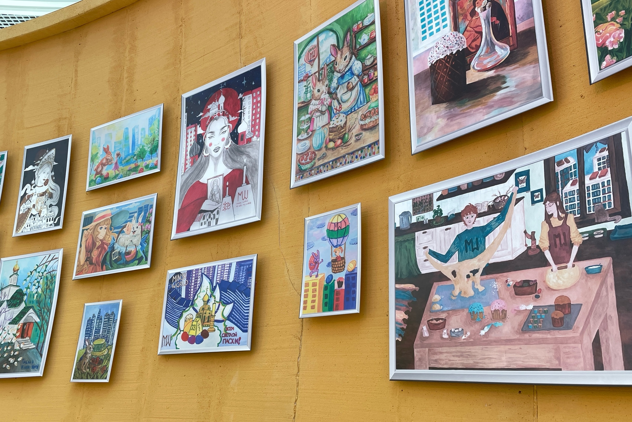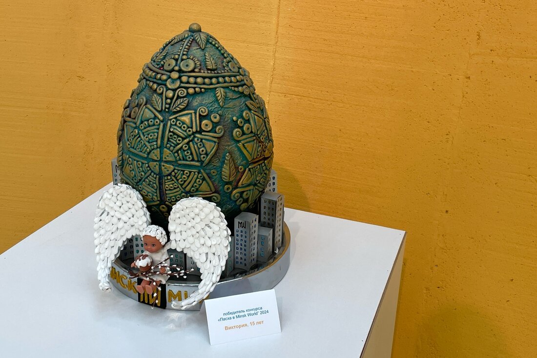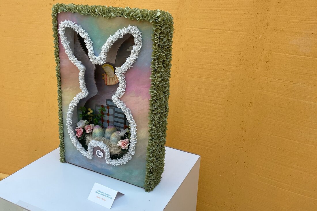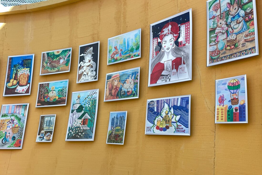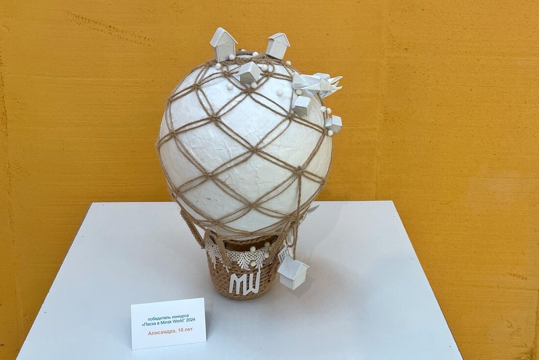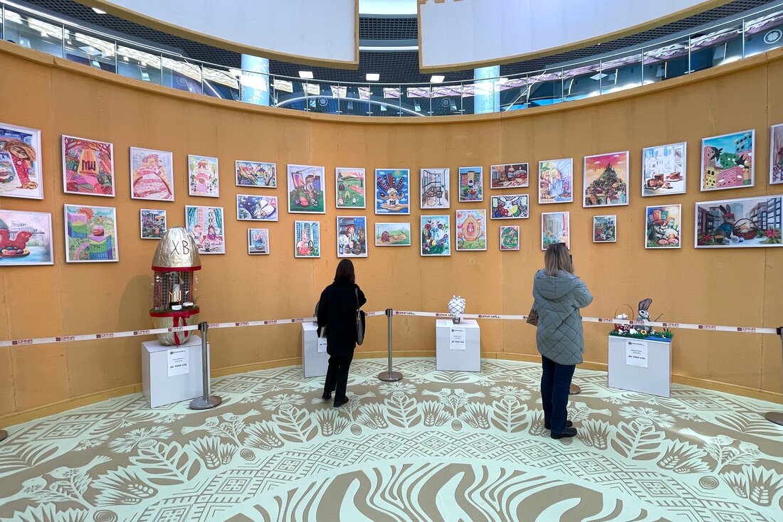 Внутри — выставка работ детей — участников конкурса «Пасха в Minsk World». Это картины и инсталляции пасхальной тематики, которые они присылали на конкурс.