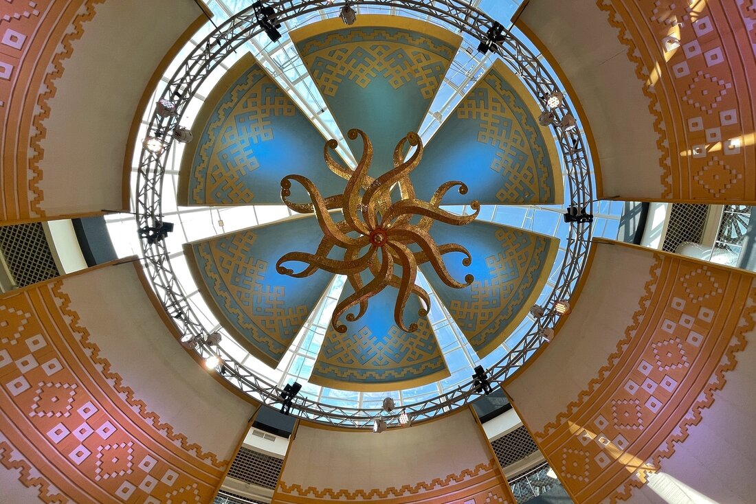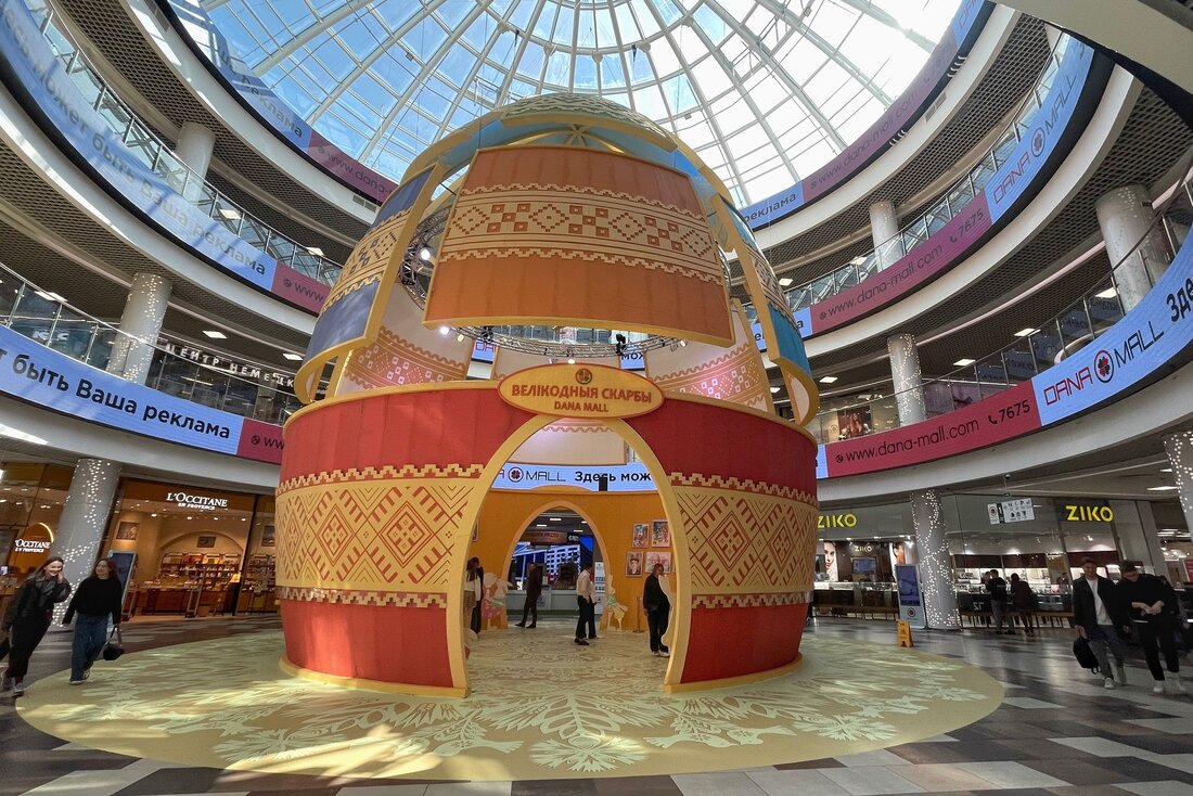 К праздникам «Дана Молл» всегда украшают оригинально и масштабно. Пасха не стала исключением — на первом этаже ТРЦ установили конструкцию в виде большого пасхального яйца.