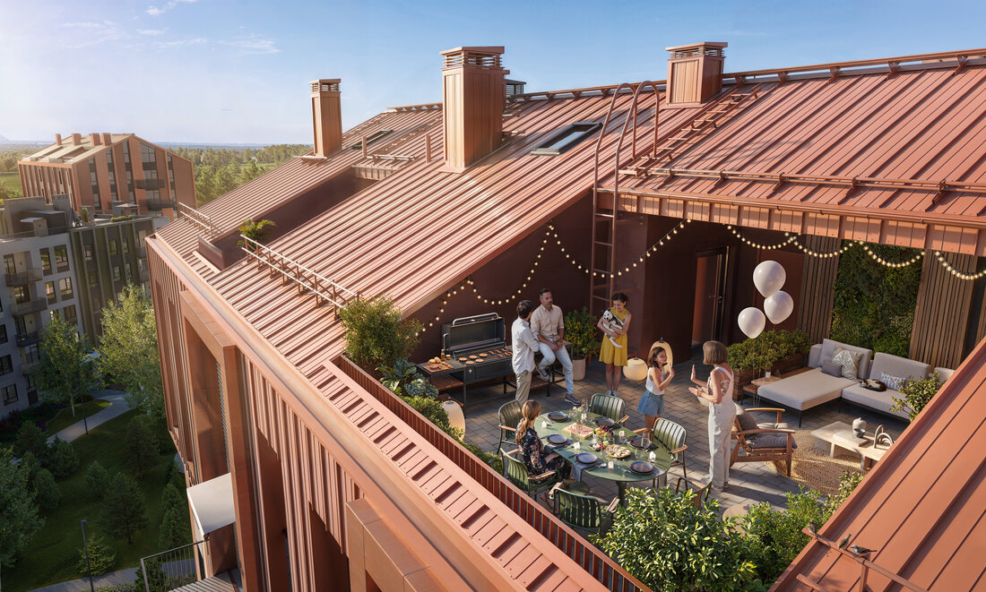 Ну, а две мансардные квартиры на последнем этаже получат просторные террасы на крыше площадью 25 и 43 квадратных метра. Их владельцы смогут прямо из комнат попасть на эксплуатируемую кровлю, обустроить там зону отдыха и провожать закаты. Такое архитектурное решение в квартале Зеленая гавань будет реализовано впервые.