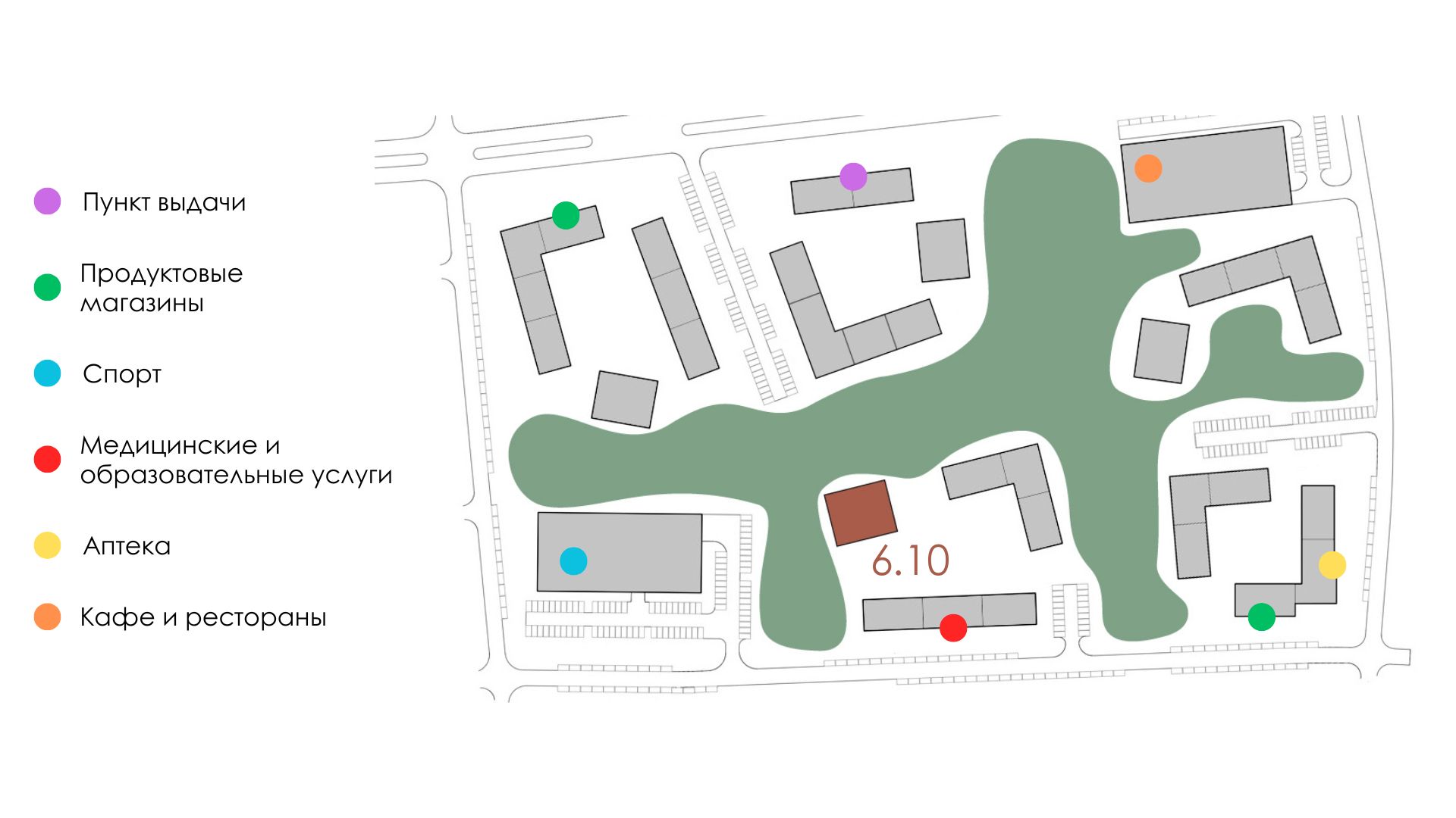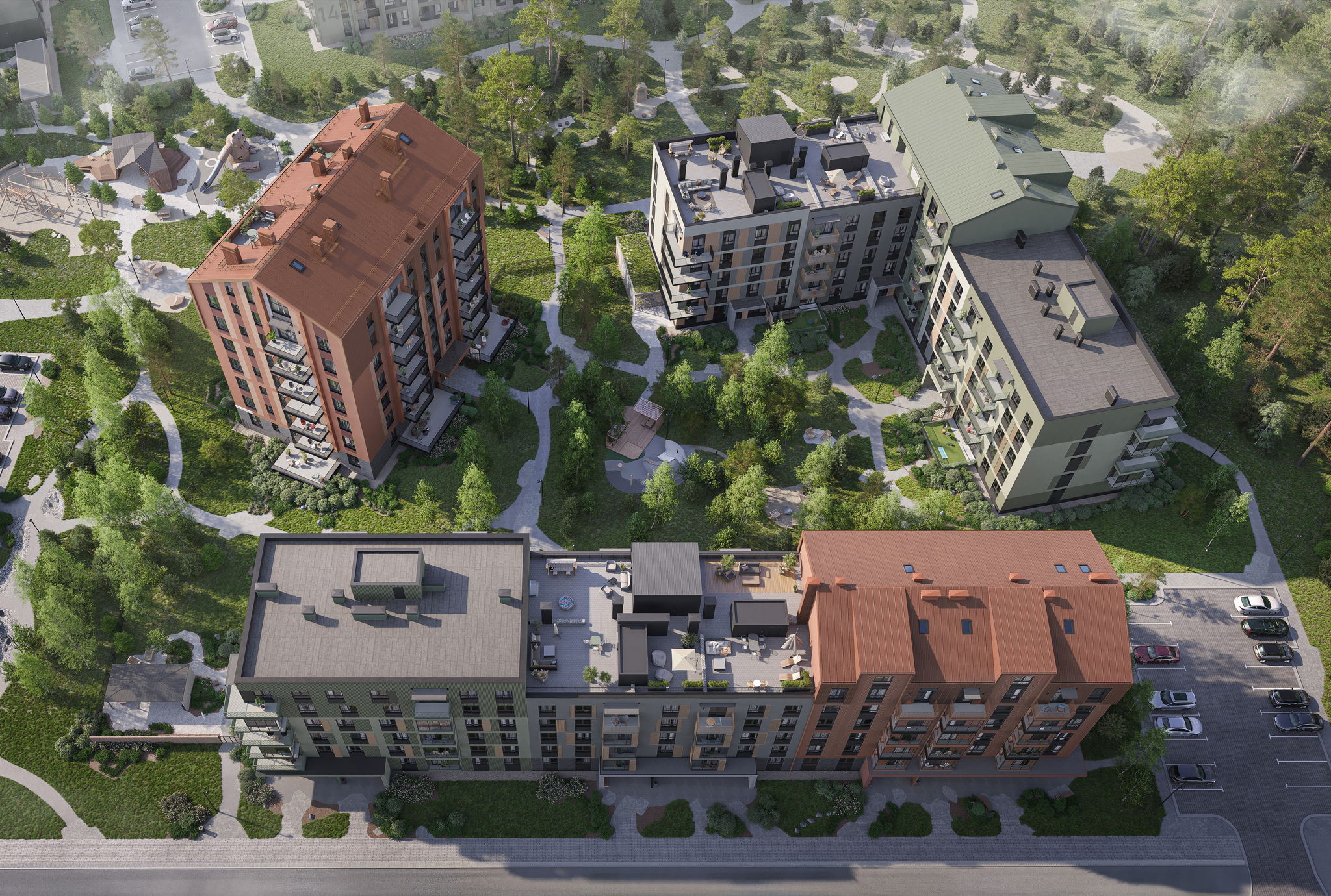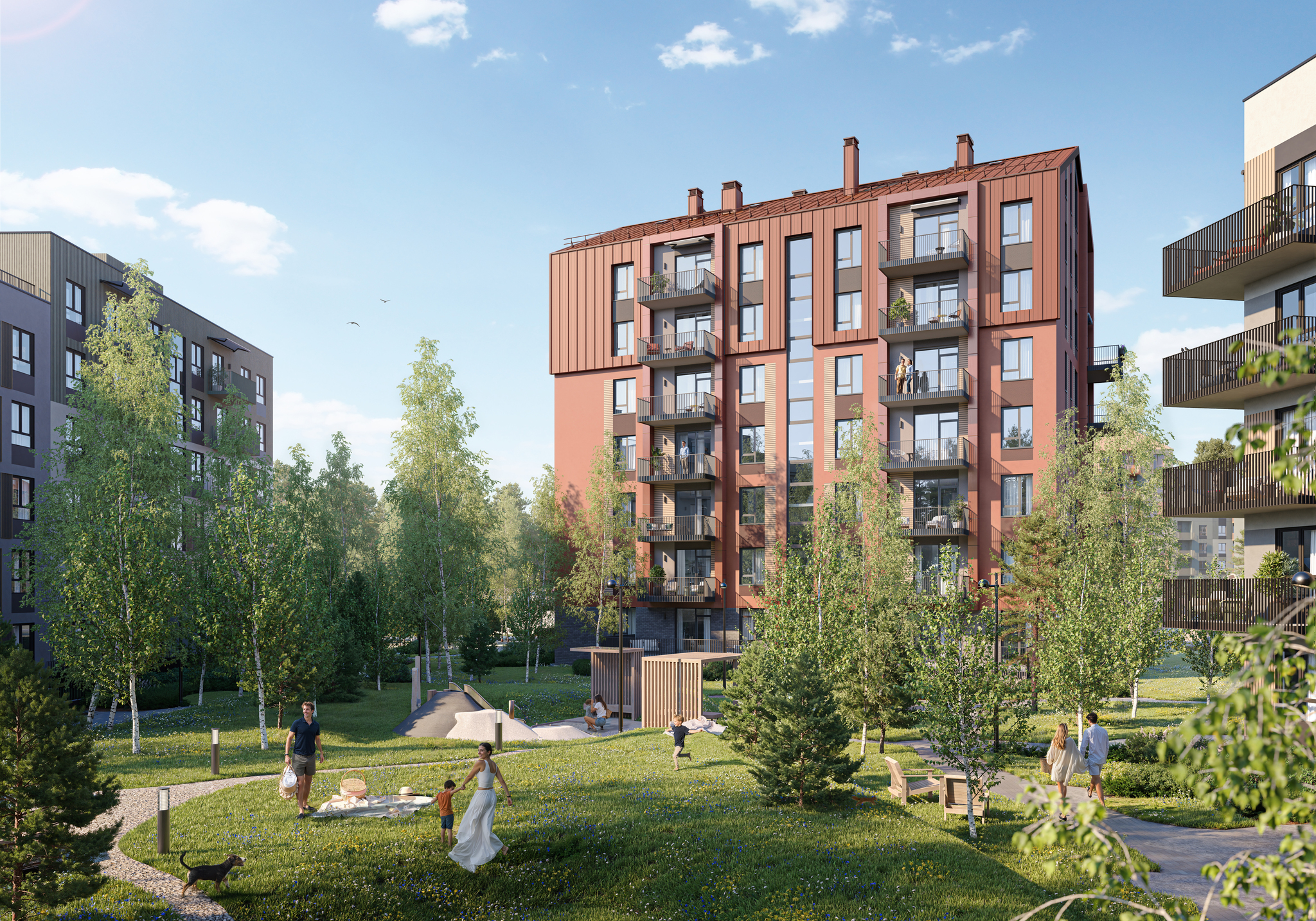 Новостройка разместится в центре квартала и с двух сторон будет окружена взрослыми лесными деревьями, которые сохранят во время строительства. В шаговой доступности от дома будут магазины, кафе, рестораны, тренажерный зал и паркинг. Двор дома закроют для автомобилей. Детям обустроят игровую площадку, а взрослым — тихую зону с навесом для отдыха и соседский центр, чтобы проводить время вместе.