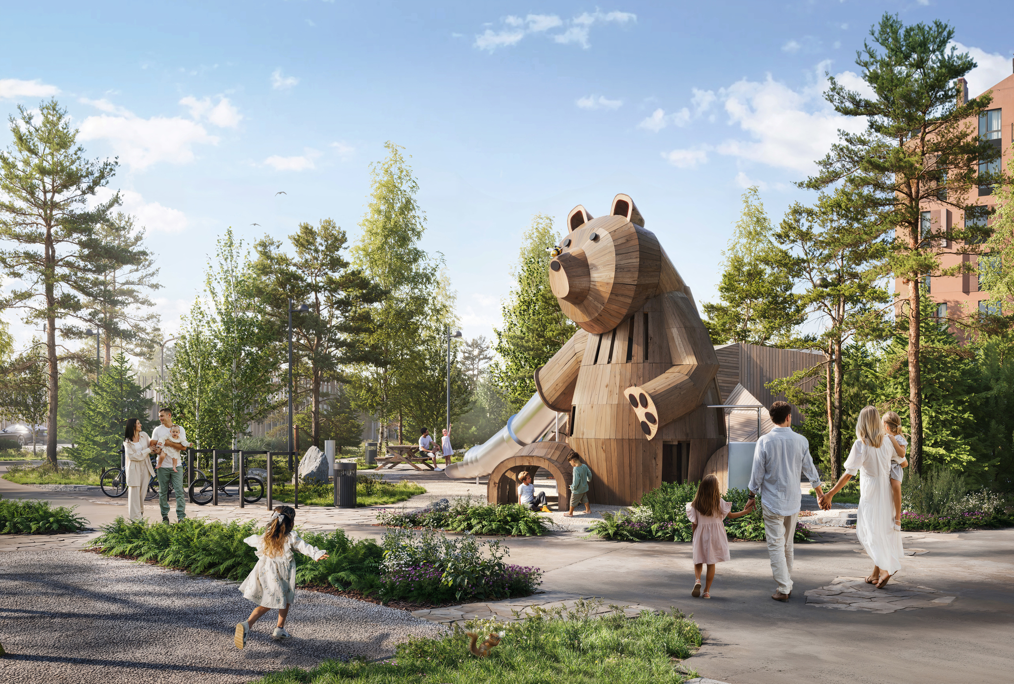 Фишкой новой группы домов станет расположенная вблизи современная игровая зона с горкой в виде медведя. Рядом будет навес для игр в виде айсберга, по которому можно будет лазать и весело проводить время. Продуманы качели и веревочный городок.