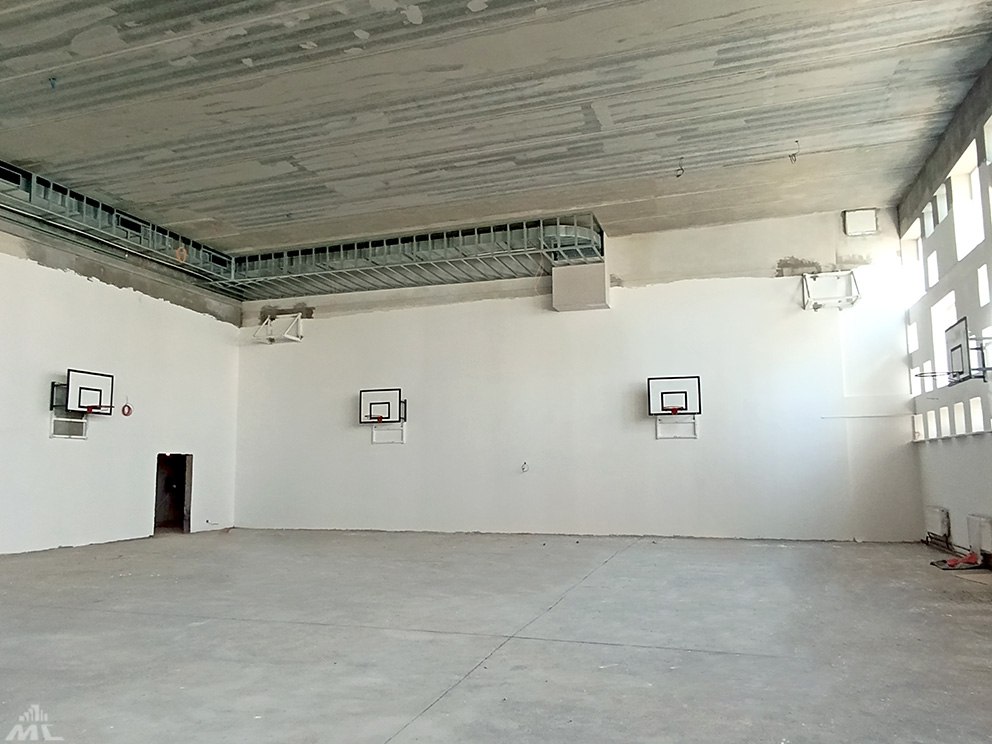 Внутри школы на Николы Теслы в Минск-Мире продолжаются отделочные работы: идет монтаж подвесных потолков и гипсокартонные зашивки. На финише облицовка плиткой, на 95% готова укладка плитки на полах. Строители приступают к финишной покраске помещений четвертого этажа.