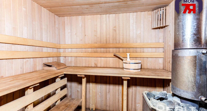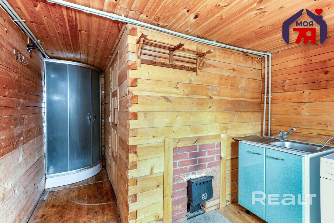 Общая площадь — 42 квадрата. Отопление печное, а печь с лежанкой. Своя скважина, вода сезонная, разведена по всему участку. Есть летняя кухня, баня и гараж, построенные из кирпича. Внутри они, как и дом, отделаны деревом.