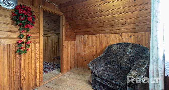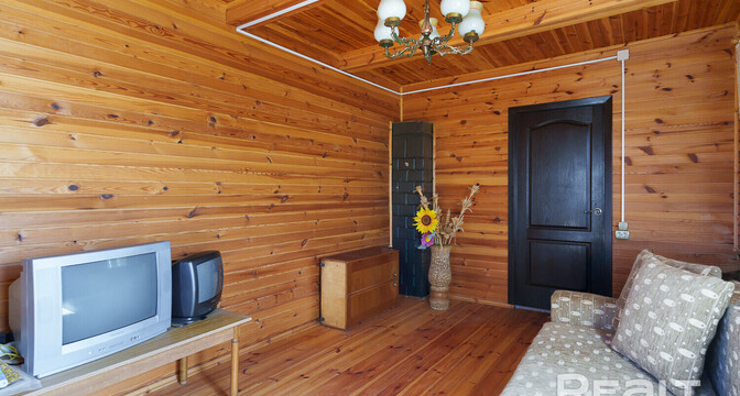 Дом одноуровневый с мансардой, бревенчатый. Построен в 2009 году. Крыша из металлочерепицы. Общая площадь — 63 квадрата.