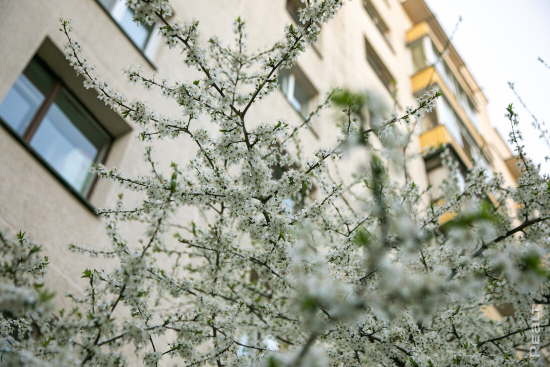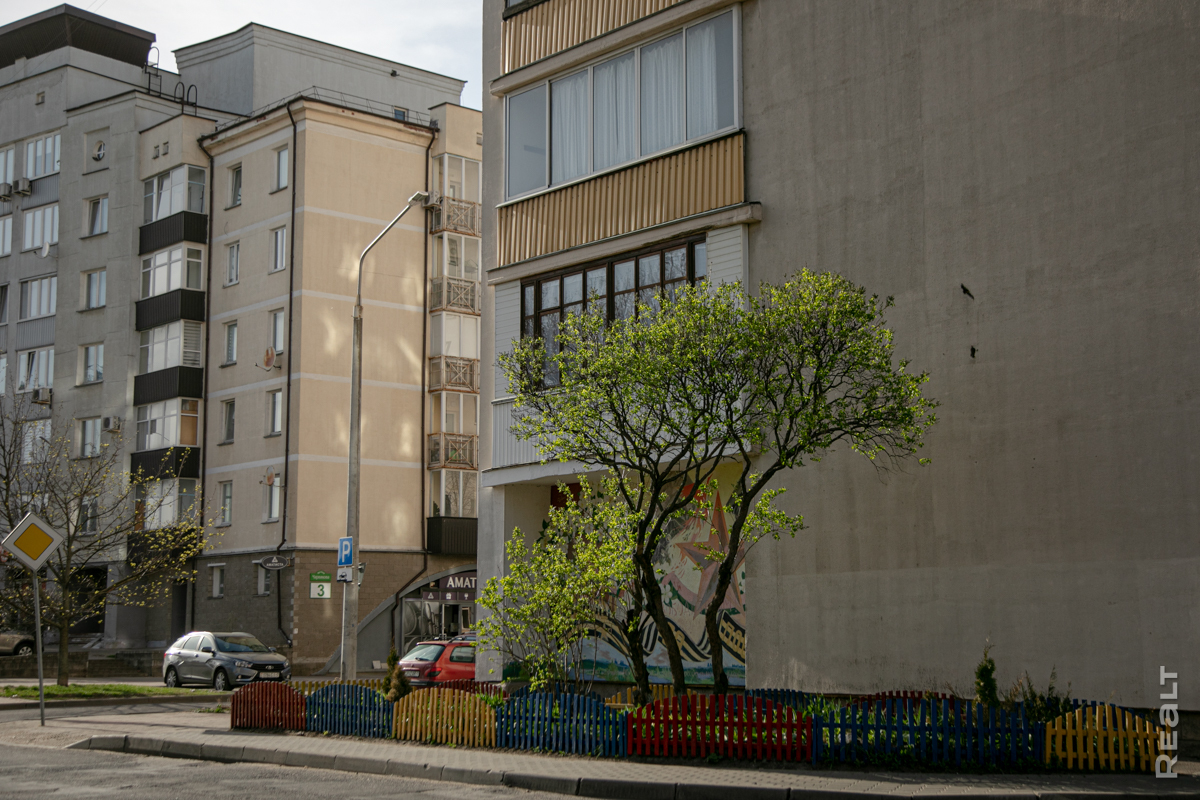 Территория вокруг дома ухоженная. Перед муралом сделана зона с цветами, у подъездов зацвели вишни. Каждое дуновение ветра ведет за собой шлейф приятного сезонного аромата. Насладиться такой погодой приходят даже люди из других домов.
