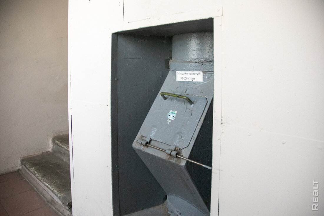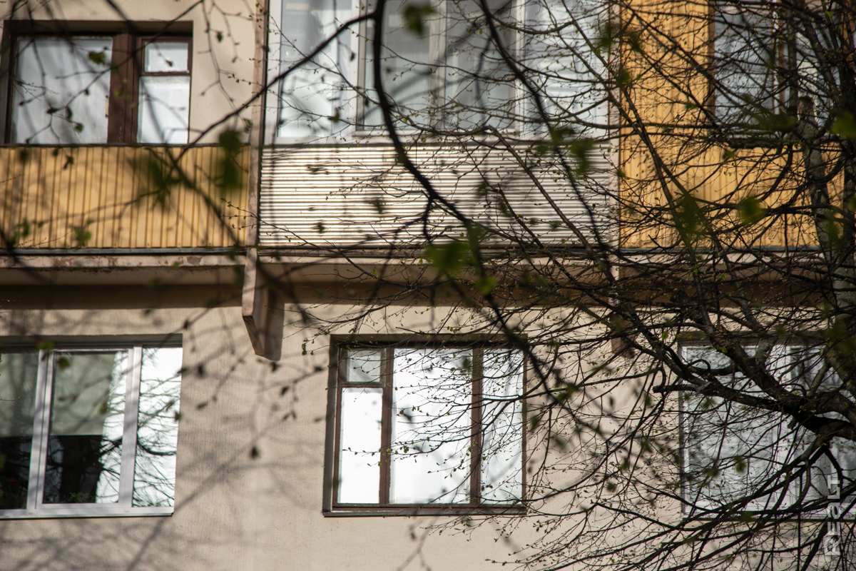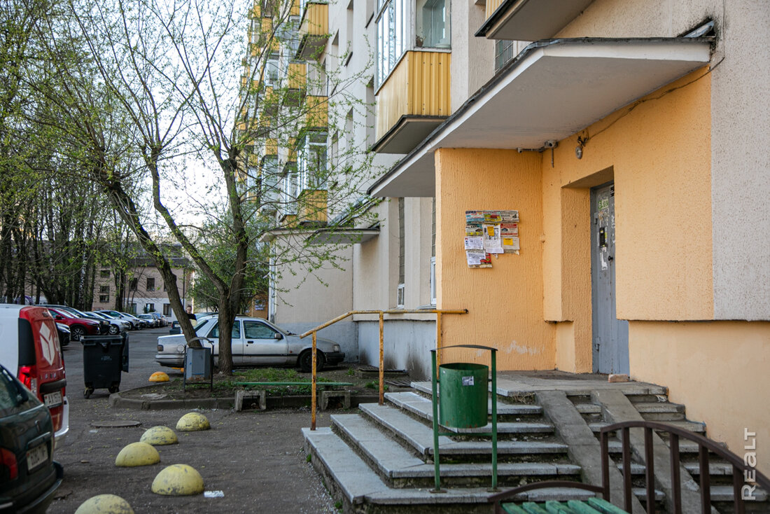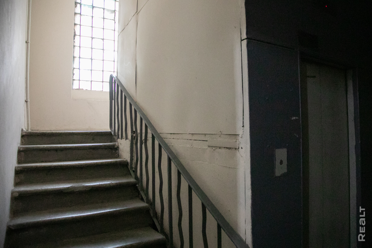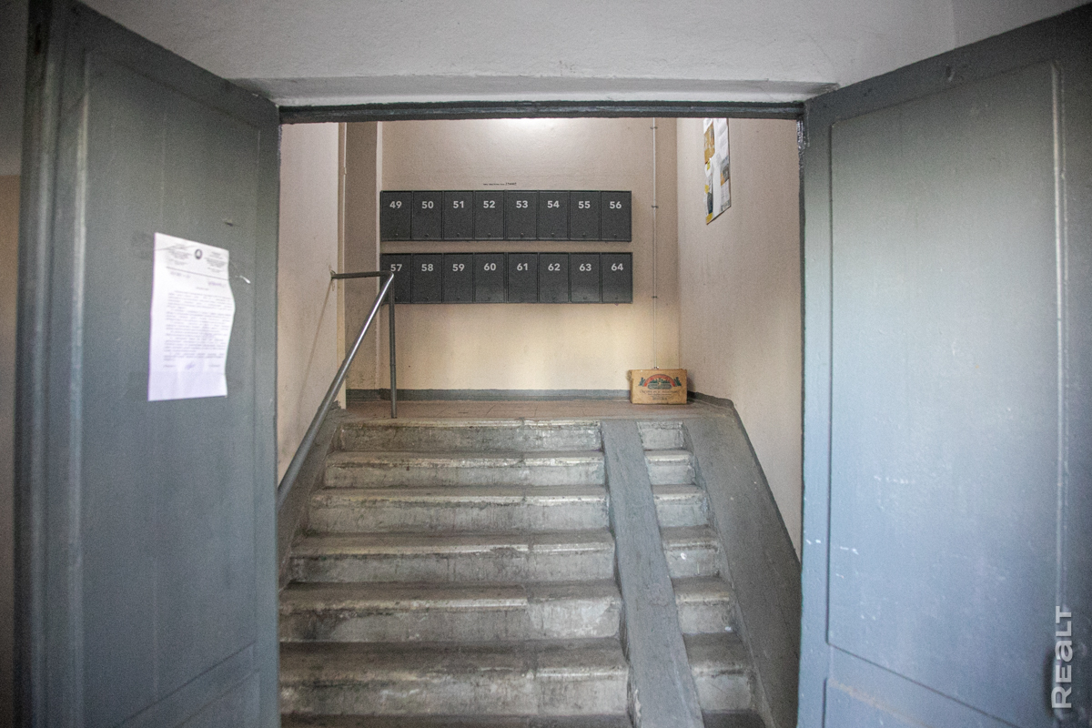 Дом из шести подъездов заливается закатным светом. Солнечные лучи пробиваются даже через серые уставшие стеклоблоки в подъездах. Года лишили их нарядности, но на фоне современных отделок, эта советскость — изюминка, которую хочется сохранить. За подъездной дверью также остановилось время. Распашные серые двери впускают в просторный холл, а сбоку — выход к лифту и лестнице. На этаже располагаются два тамбура и 4 квартиры.