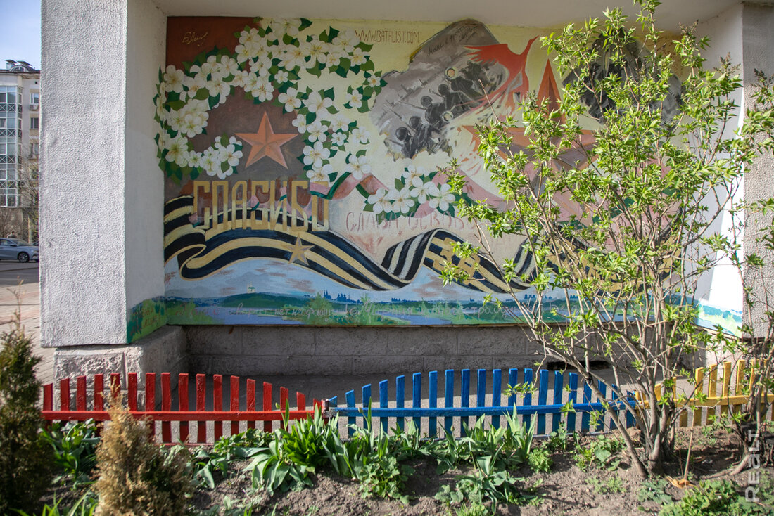 О людях, которые здесь жили напоминает мурал на торце дома. Он появился в 2020 году. Написал его художник-баталист Владимир Сайко в честь 75-летия окончания войны.