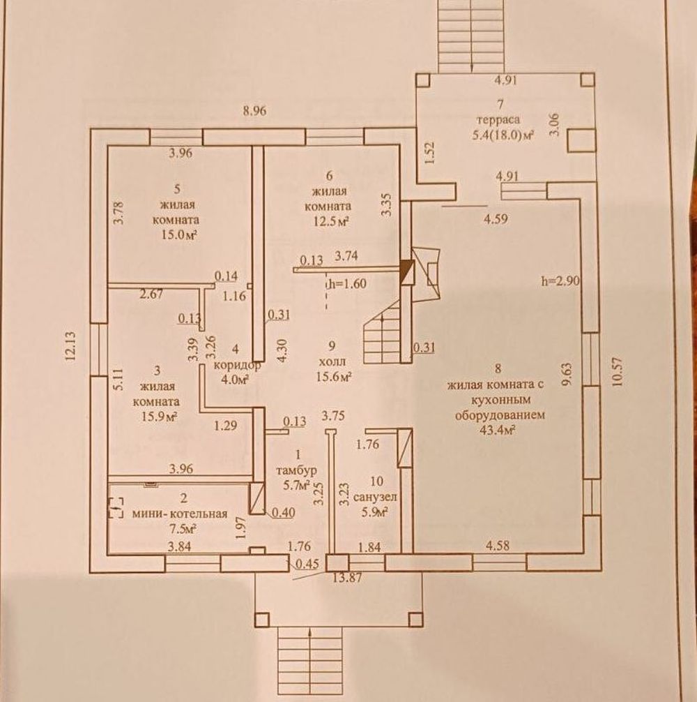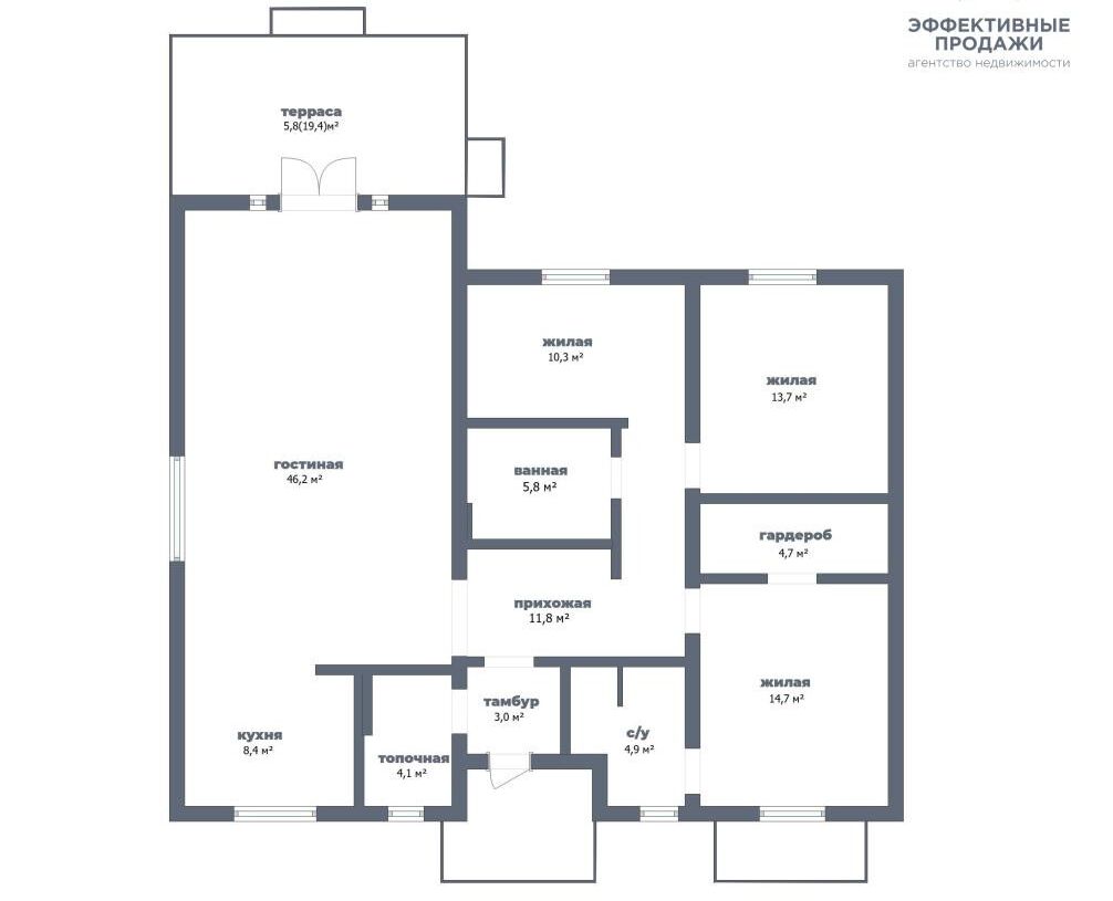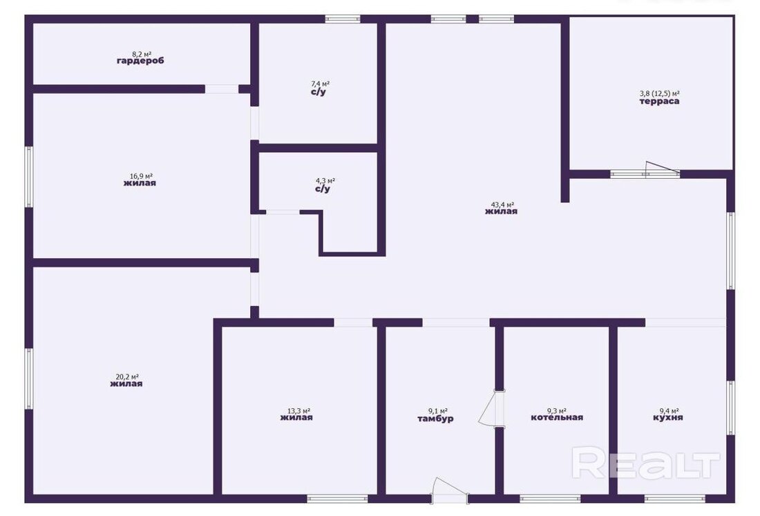 Дом одноэтажный, построен из блоков, на крыше – металлочерепица. Окна ПВХ, с ламинацией. Общая площадь 133,2 м2. Планировка такая: кухня-гостиная, мастер-спальня с санузлом и гардеробом, две спальни, санузел, топочная. Снаружи к дому примыкает две террасы. В некоторых комнатах уже сделан ремонт.