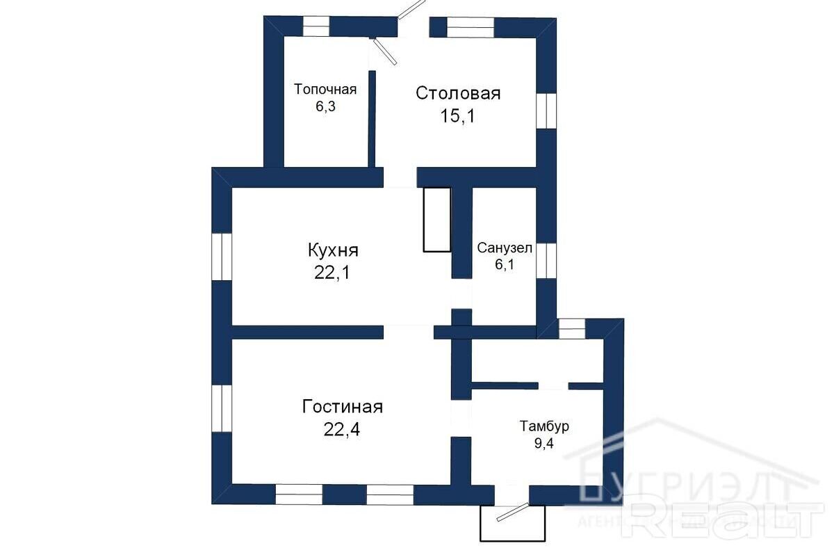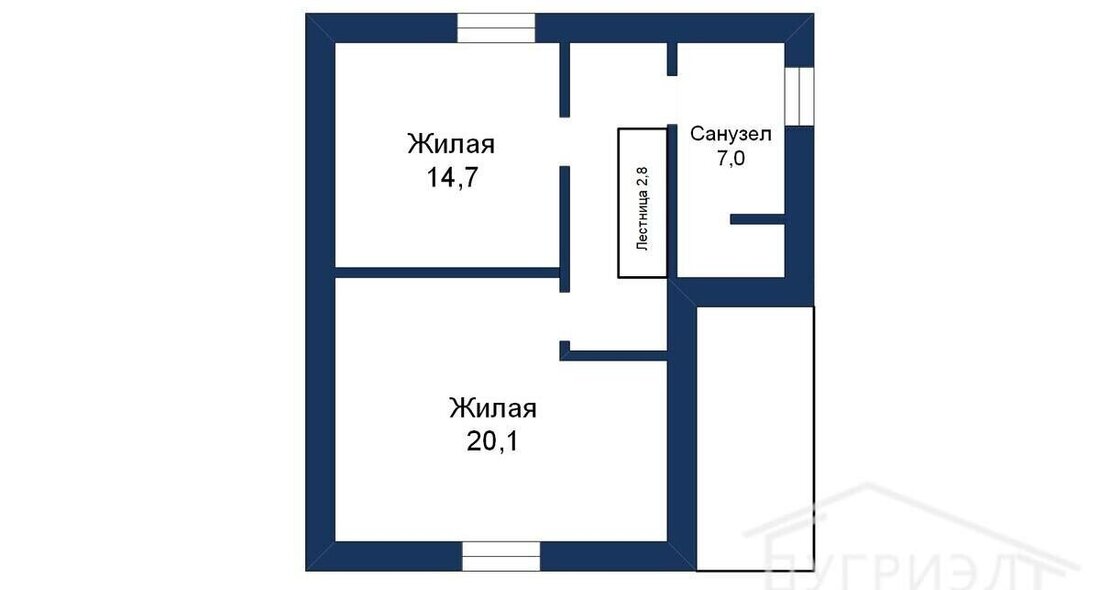 Внутри предусмотрены две спальни, гардеробная, два санузла, гостиная, кабинет, кухня, топочная с прачечной и терраса. Имеется дизайн-проект.