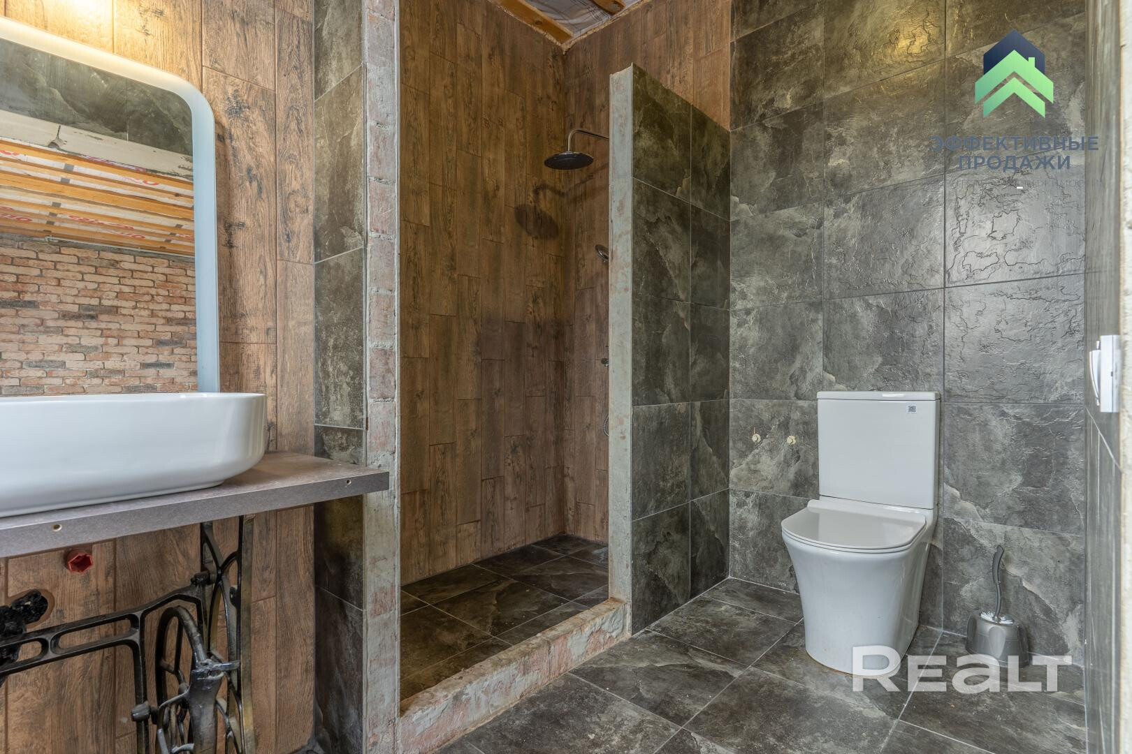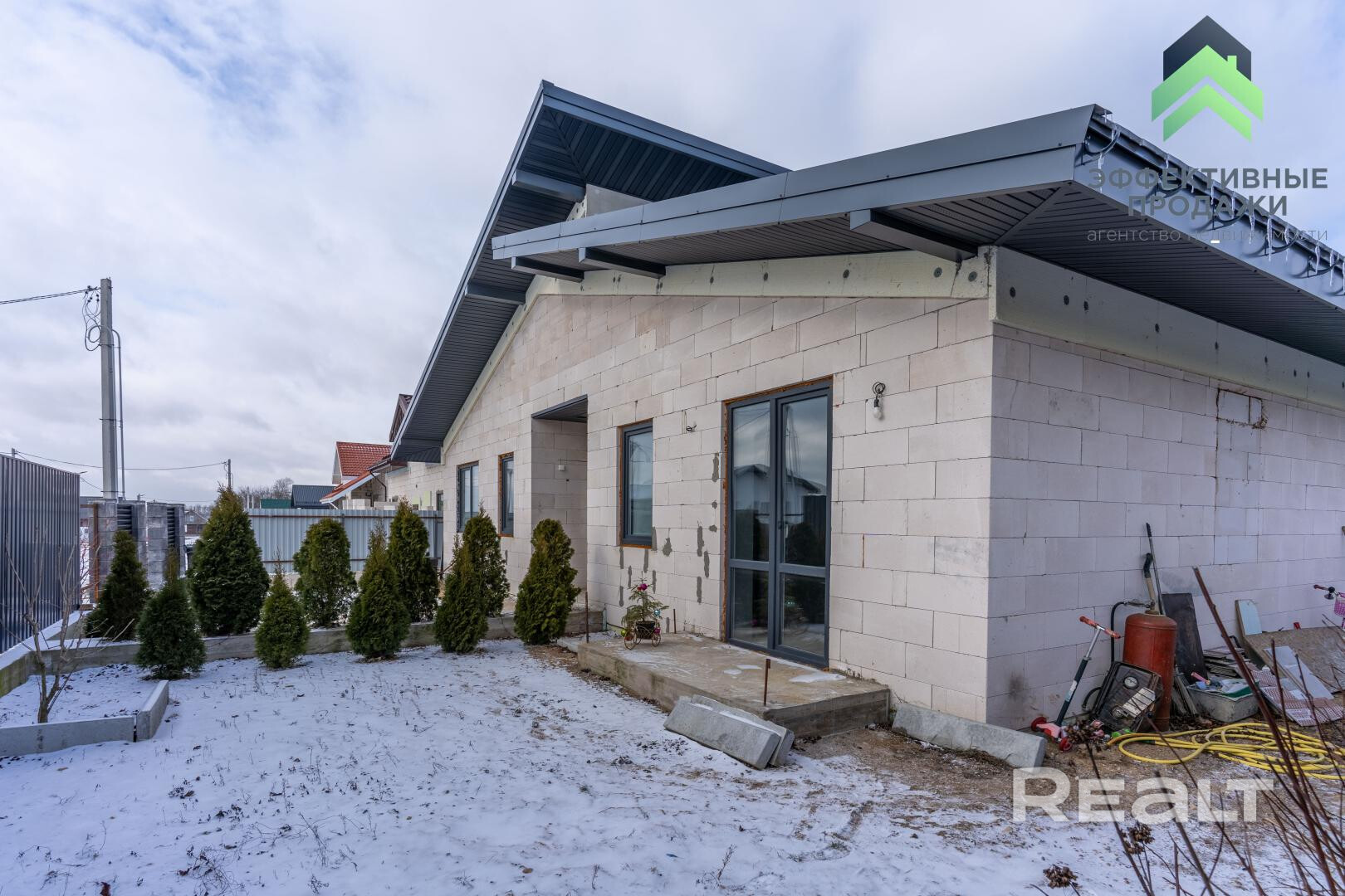 Здесь дом 2024 года постройки. Построен из блоков, утеплен и облицован декоративным кирпичом. Перекрытие монолитное, на крыше – металлочерепица. Внутри выполнены все черновые работы, смонтированы коммуникации – осталась финишная отделка.