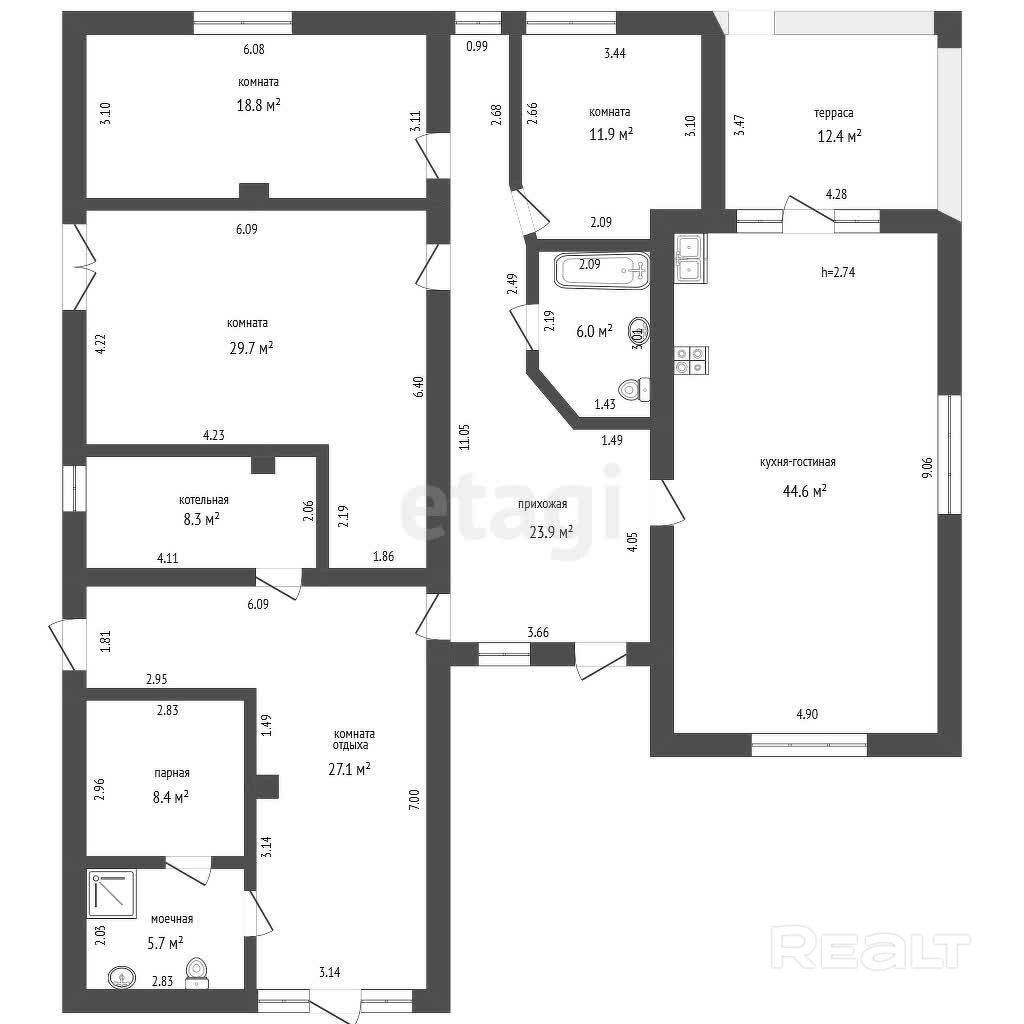 Здесь продается коттедж общей площадь 188 м2. Цокольный этаж занимает 60 квадратов.