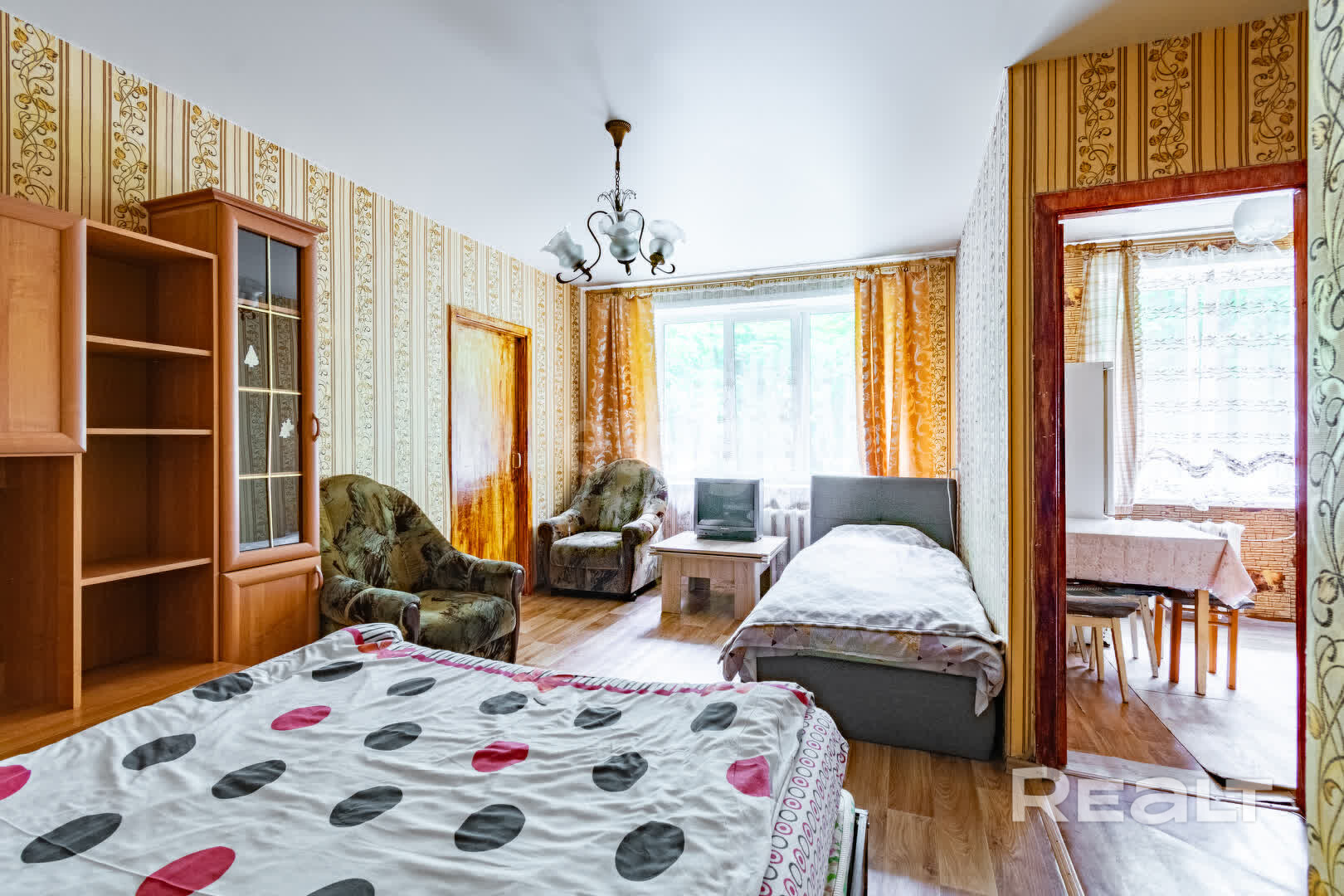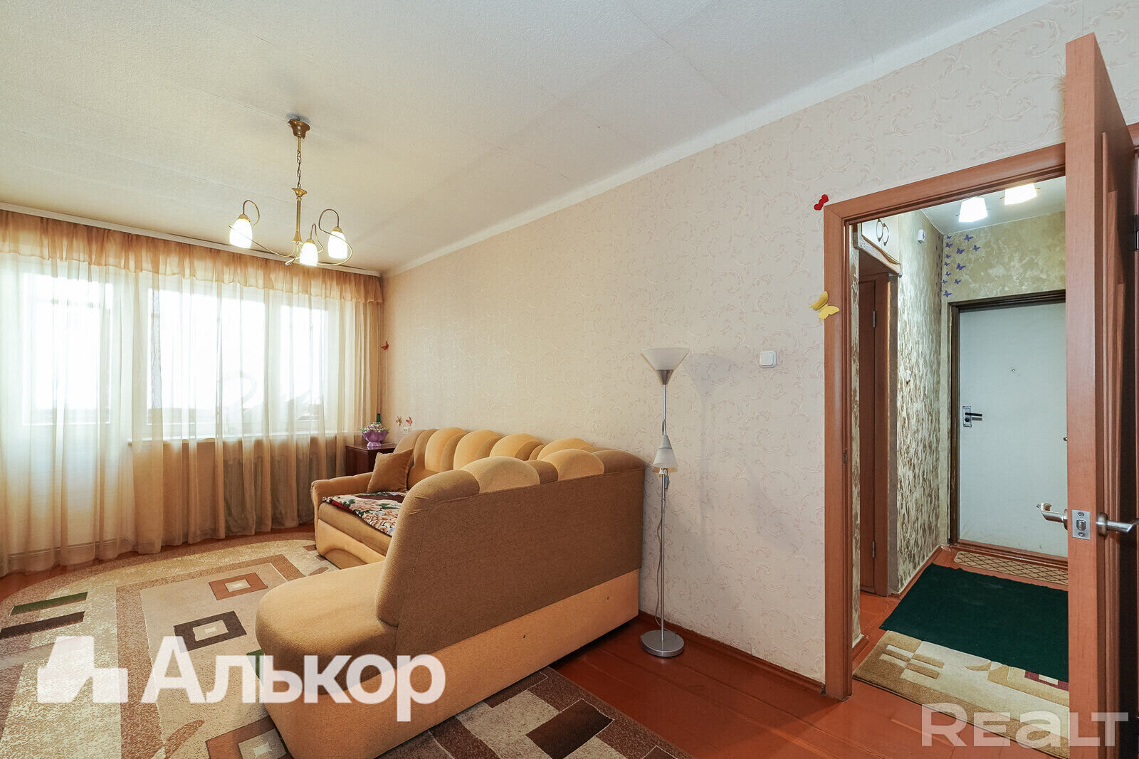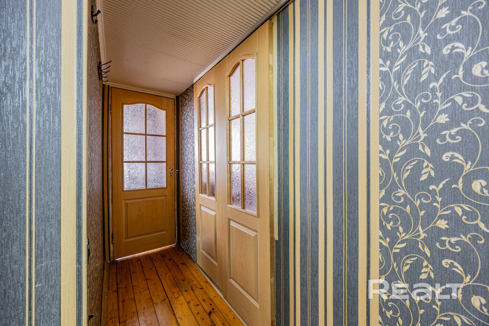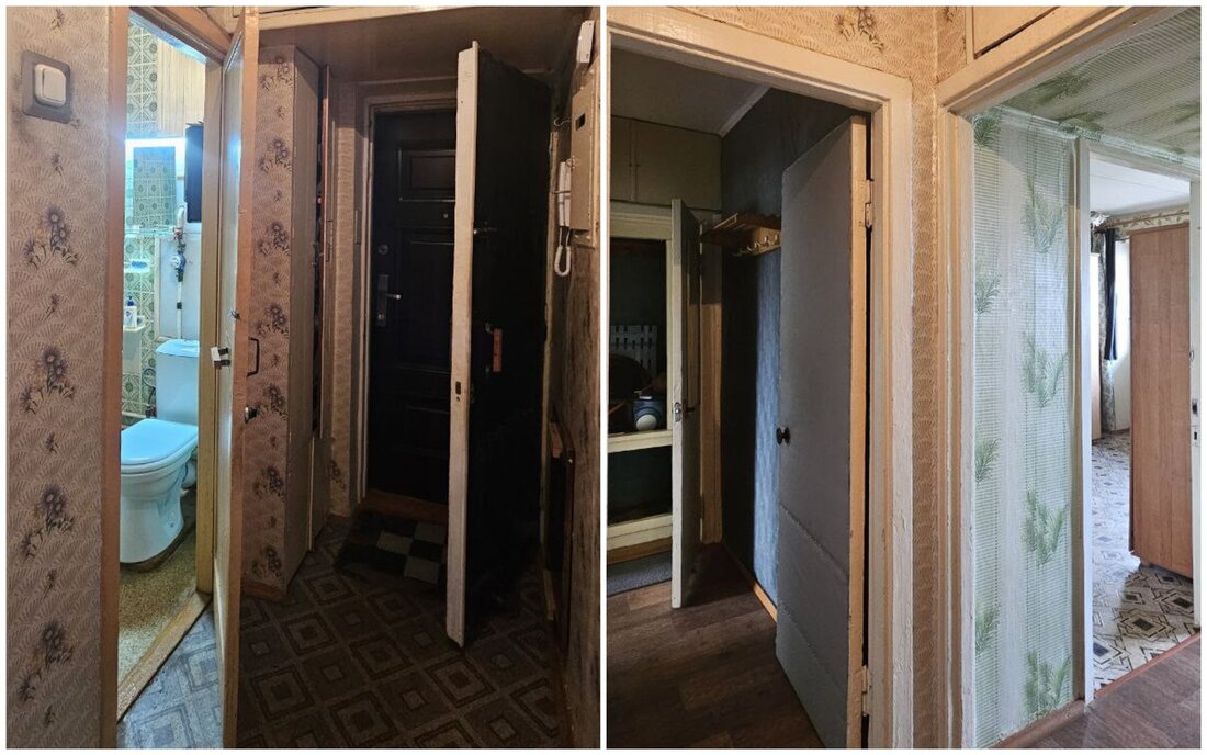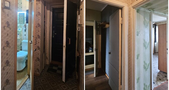 Квартира нуждается в ремонте. Здесь две изолированные комнаты, в коридоре есть небольшая ниша под шкаф.