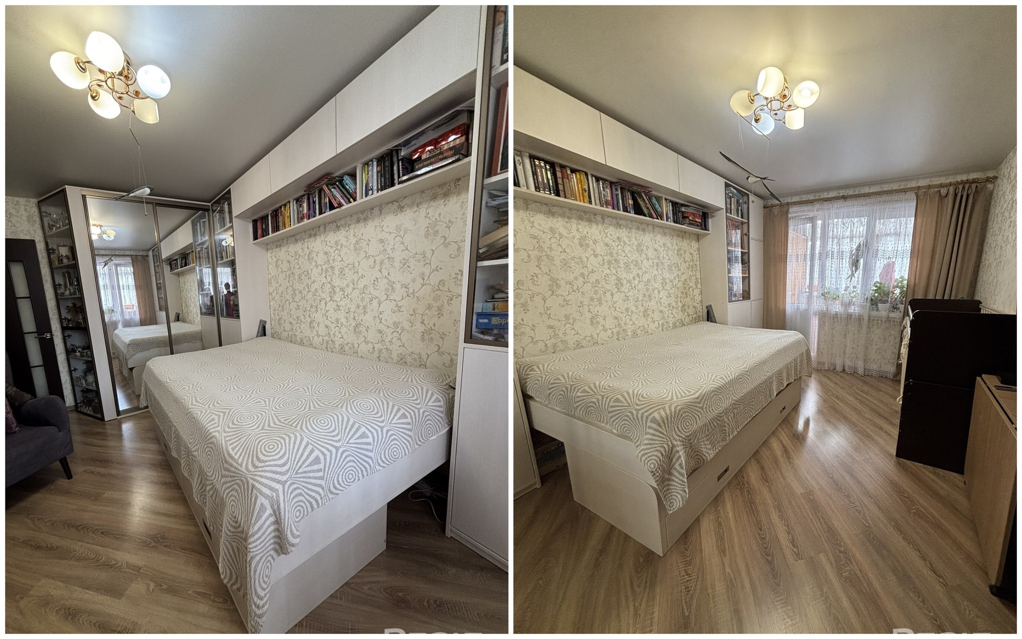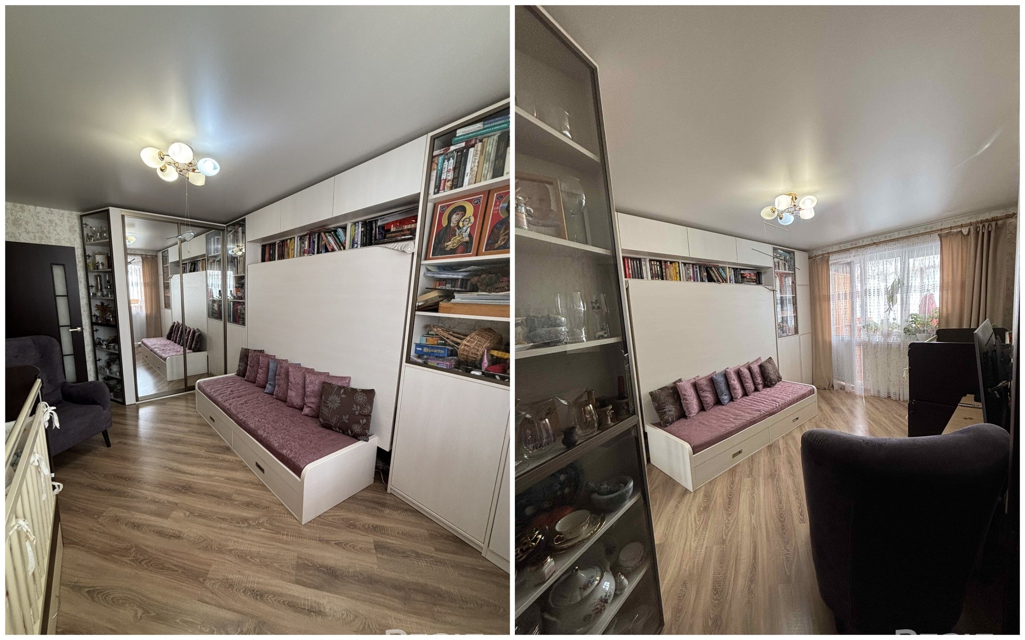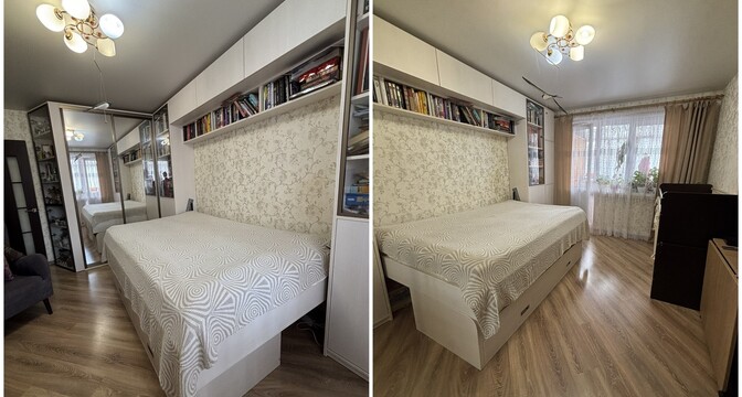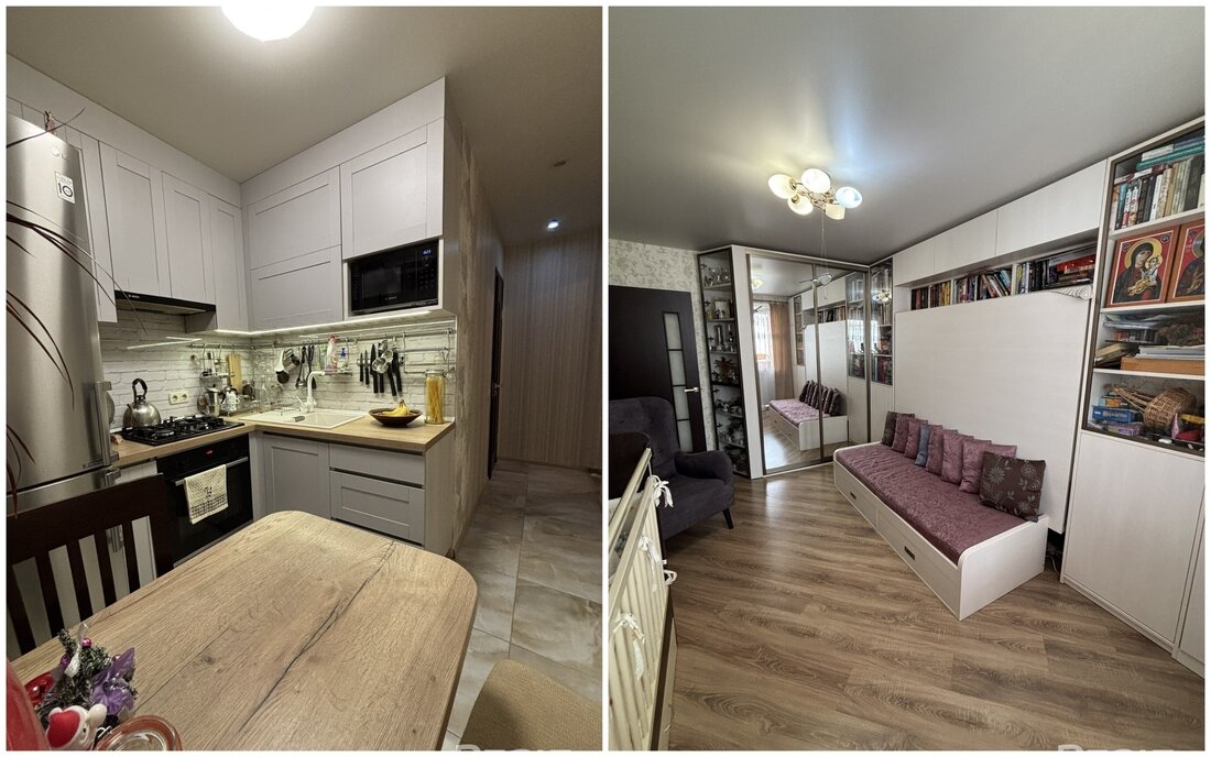 Здесь две изолированные комнаты. Кухня обставлена техникой. В окнах стоят стеклопакеты ПВХ, стены были выровнены, потолки тут натяжные. На полу лежат ламинат и плитка. В коридоре остается встроенный шкаф-купе.