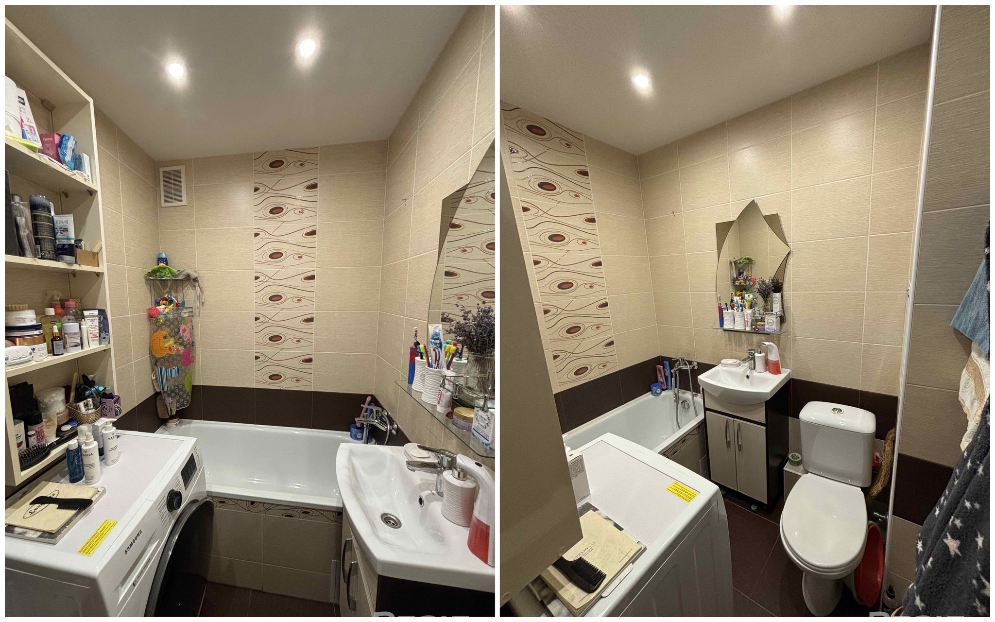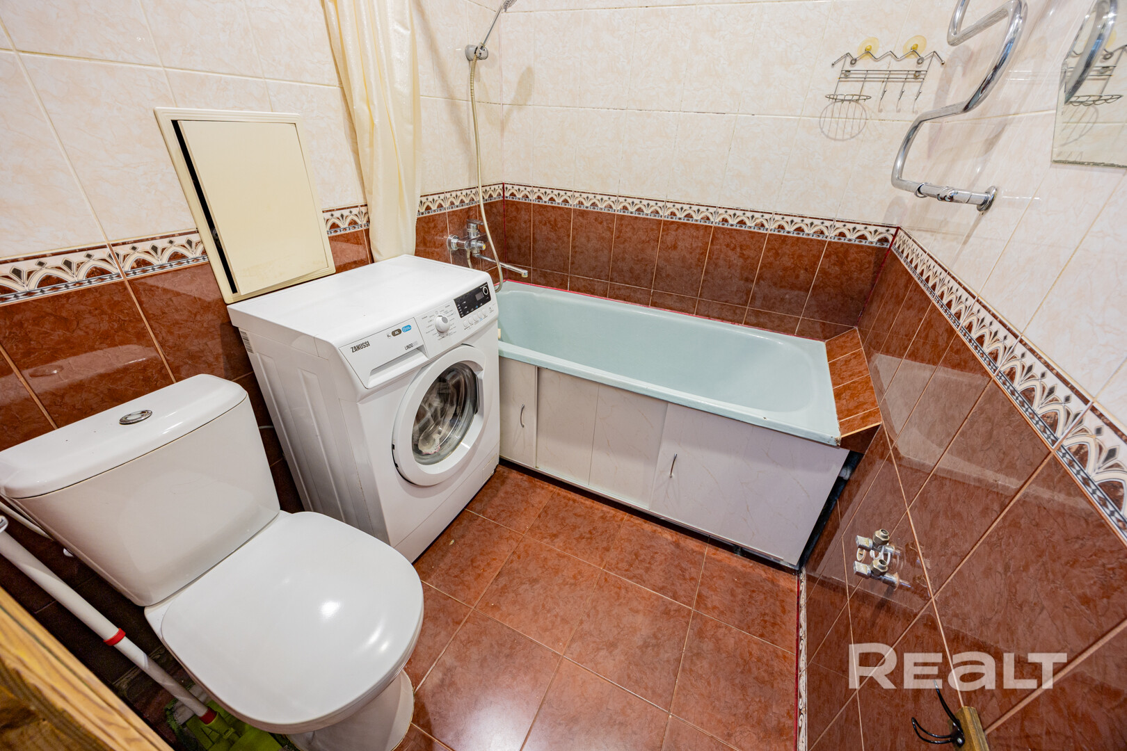 Совмещенный санузел облицован плиткой.