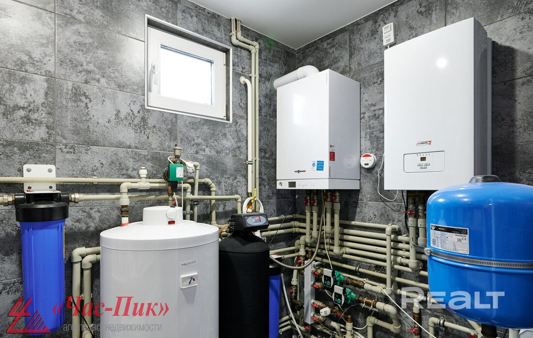 В топочной установлена система отопления с погодозависимой автоматикой и насосными группами, бойлер, стабилизатор напряжения, датчики управления температурой, система очистки воды. Подведен газ, водопровод от скважины, оптоволокно. Канализация — автономный септик. Помещения оснащены системой кондиционирования, имеется охранная сигнализация.