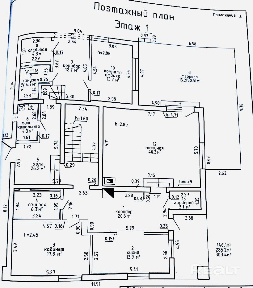 На первом этаже расположены прихожая, гостиная с камином и вторым светом, кухня, кабинет, санузел, холл, топочная, комната отдыха с еще одним санузлом, терраса.