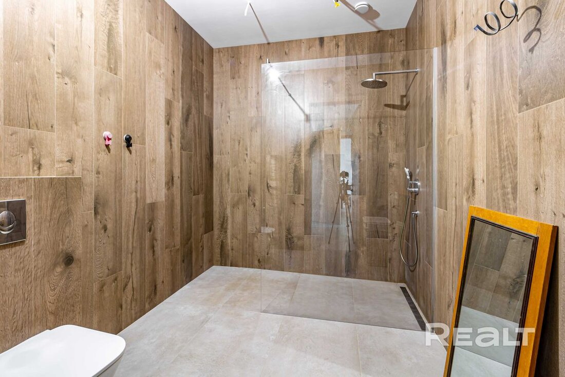 В отделке видим керамогранит на полах с водяным подогревом, паркетную доску (ясень), обои под окраску, гипсокартонные потолки, подоконники из массива дерева, деревянные ступени лестницы. Установлены межкомнатные шпонированные двери увеличенной высоты 2,4 метра.