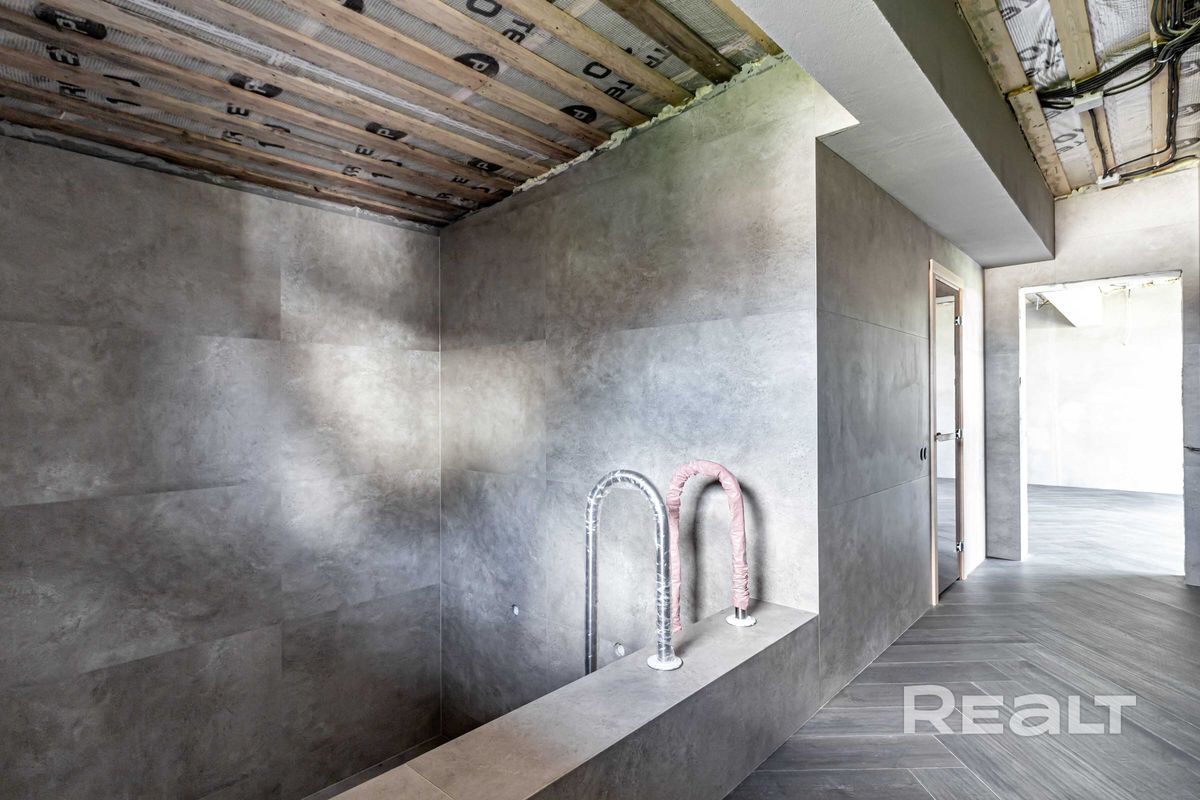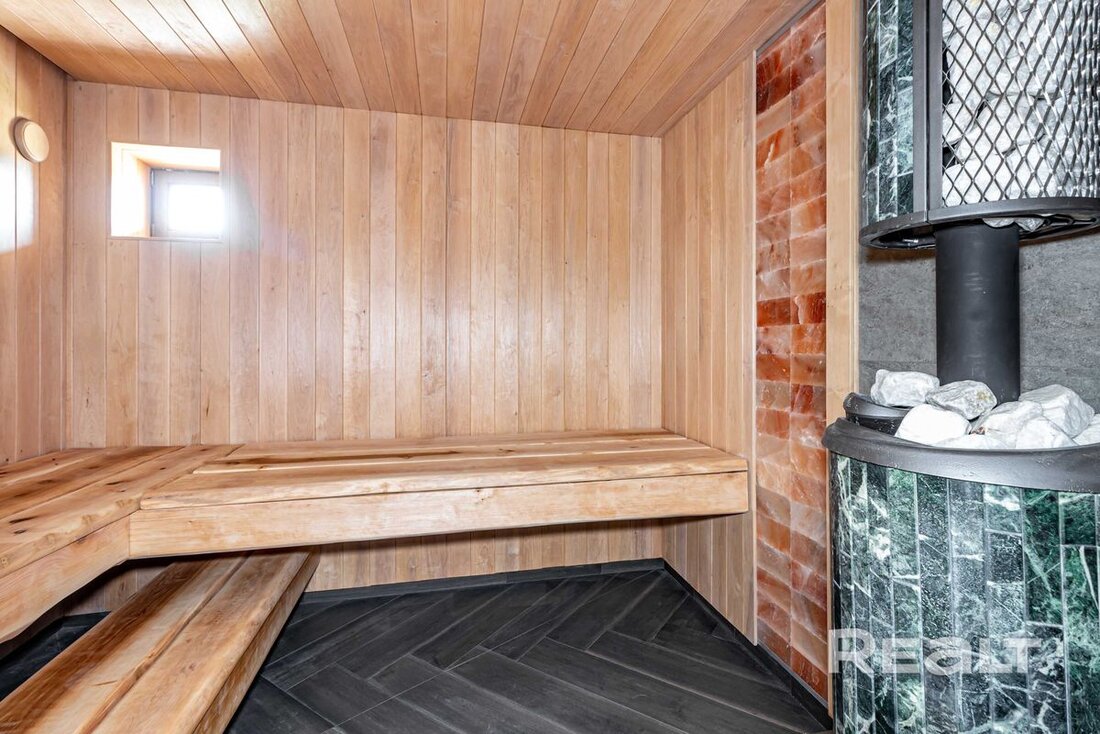 К этим же коммуникациями подключено и задание бани с гостевым домом (100 м2). В ней имеется комната отдыха с предусмотренной возможностью установки кухонного оборудования, гостевая комната, душевая, спа-зона с бассейном, парная на дровах, санузел, хозяйственная комната. В этом здание полы керамогранитные с водяным подогревом. Стенам и потолкам еще предстоят чистовая отделка, но парилкой уже можно пользоваться.