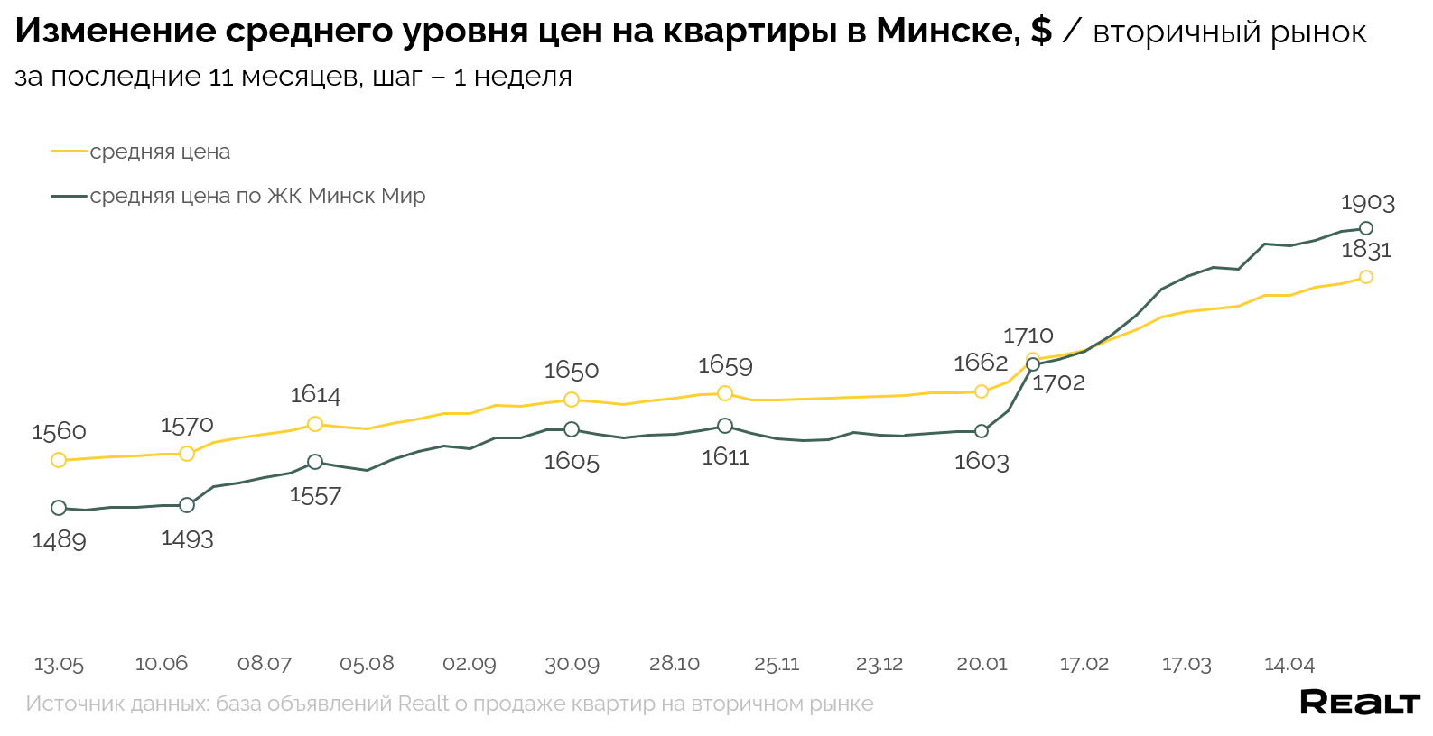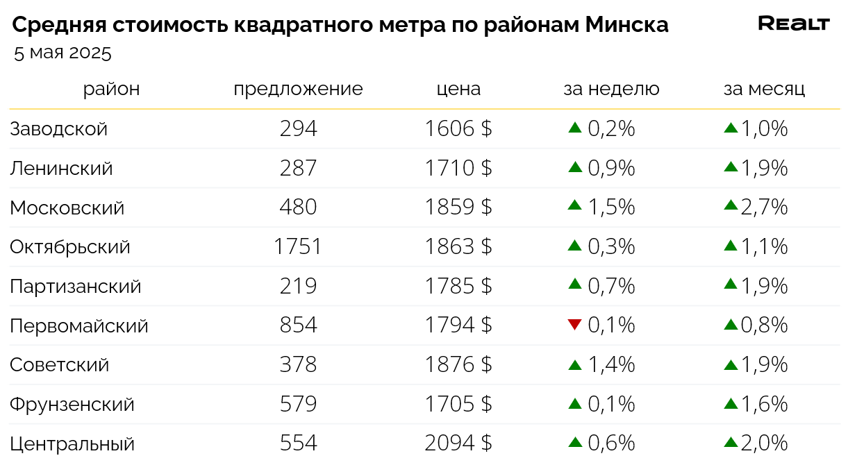 На объем предложения и индекс цен в Минске сильно влияет большое количество объявлений в базе Realt о продаже квартир в строящихся новостройках преимущественно Октябрьского, а также Центрального и Московского районов. Чтобы минимизировать их воздействие на показатели, описывающие вторичный рынок продажи квартир, все представленные ниже данные рассчитаны без учета квартир в строящихся домах.