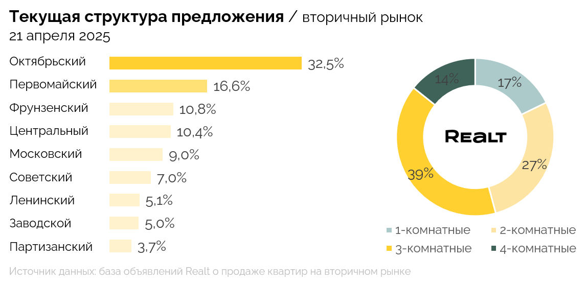 Если смотреть динамику предложения по районам города, то снижение числа объявлений также произошло во всех случаях. Наибольший отток предложения произошел во Фрунзенском и Ленинском — минус 10% и 8% соответственно, а наименьший — в Октябрьском районе (минус 2,5%).