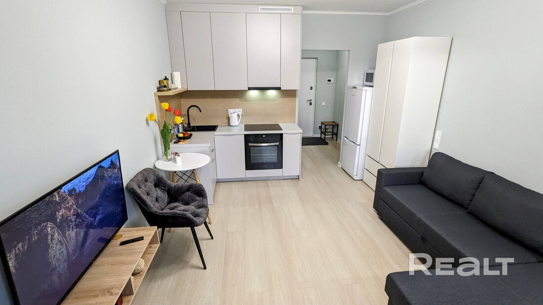 Мини-квартира полностью готова к проживанию, оснащена кухней (с плитой и духовкой) и техникой.