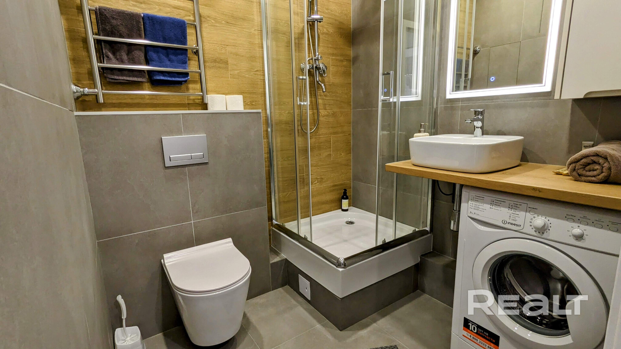 В ванной комнате установлена душевая кабина и стиральная машинка.