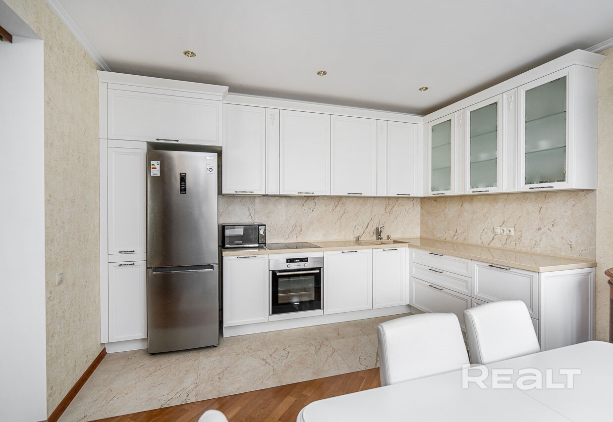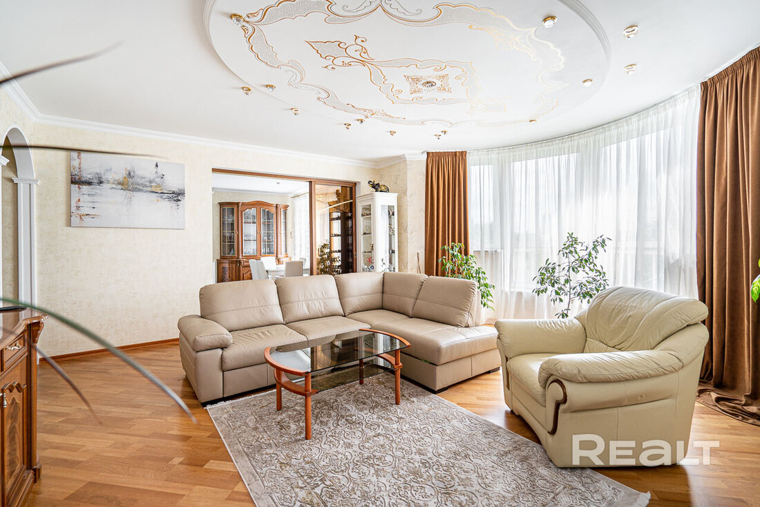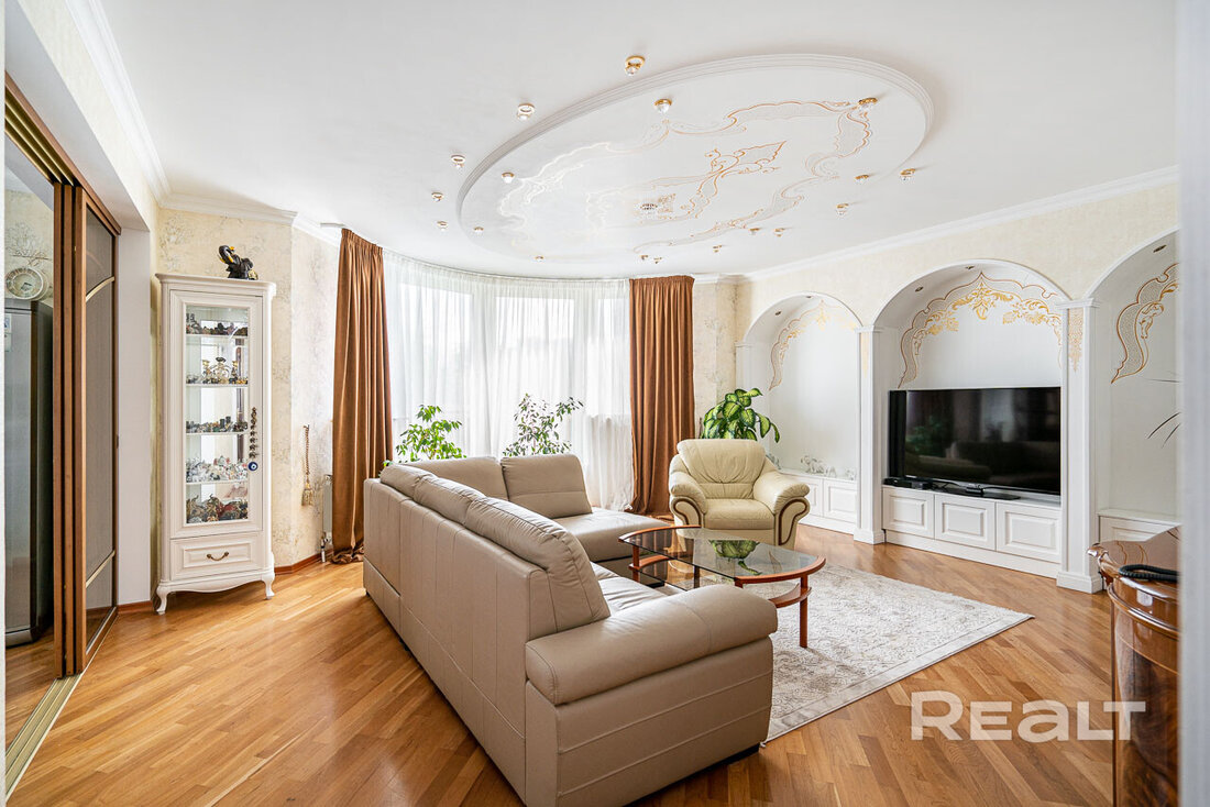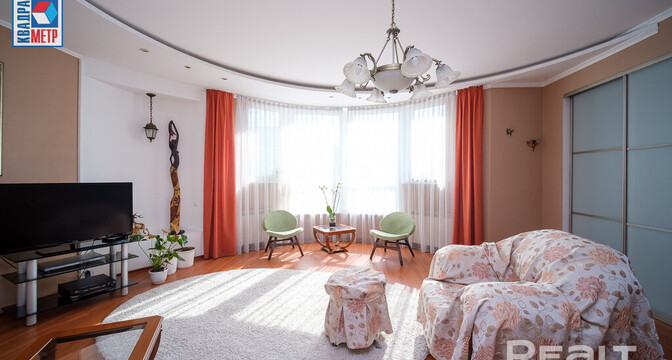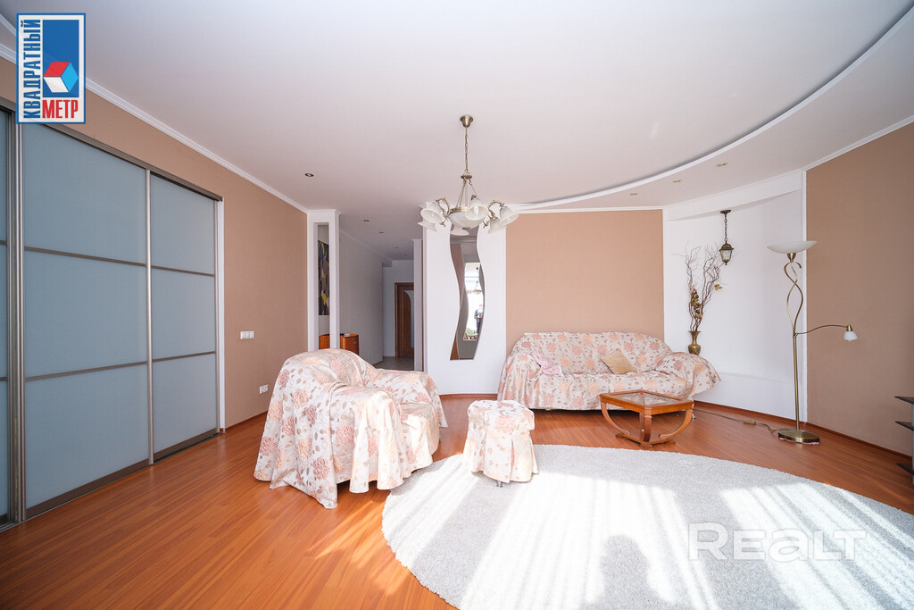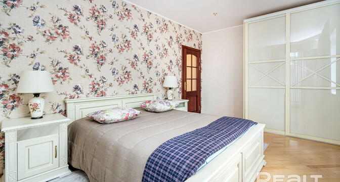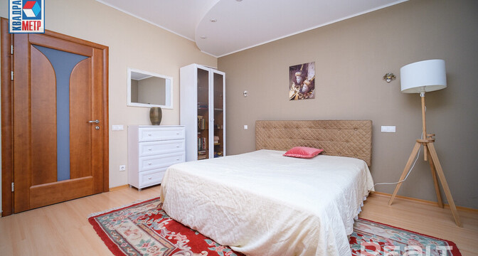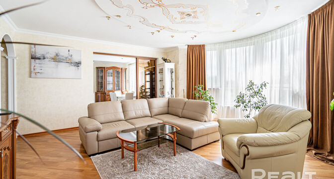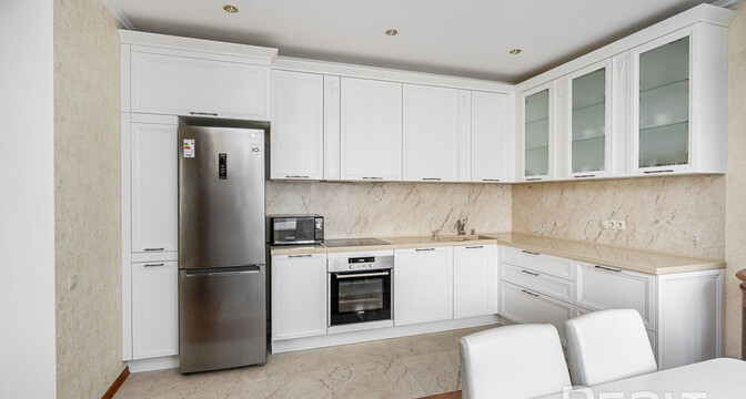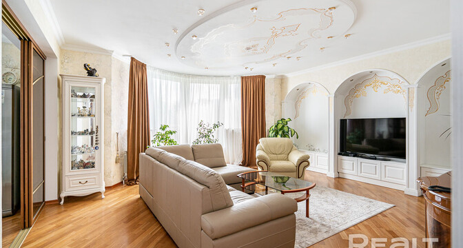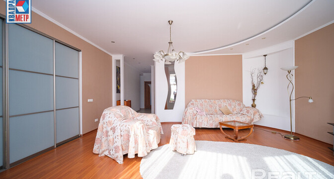 В квартире выполнен классический ремонт из качественных материалов: напольная плитка из Италии и Испании, в комнатах — немецкий дубовый паркет, межкомнатные двери из натурального массива. В квартире — два санузла, гардеробная, теплые полы. Стоимость — 188,9 тысячи долларов (1593 доллара — за метр).