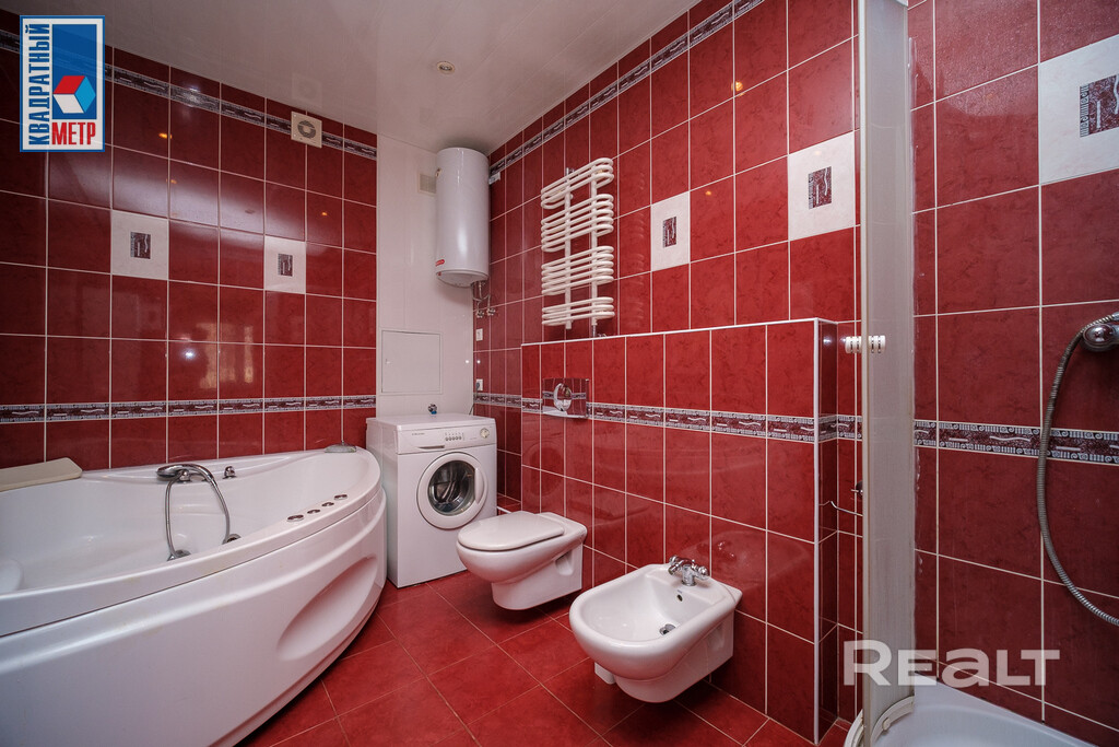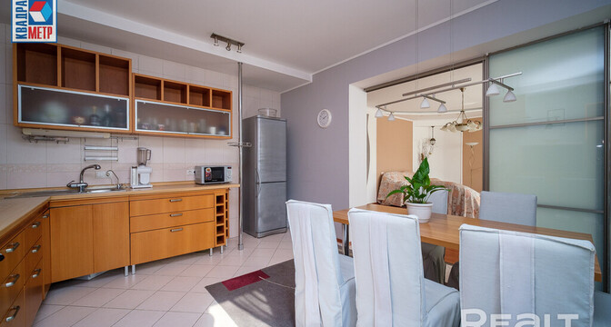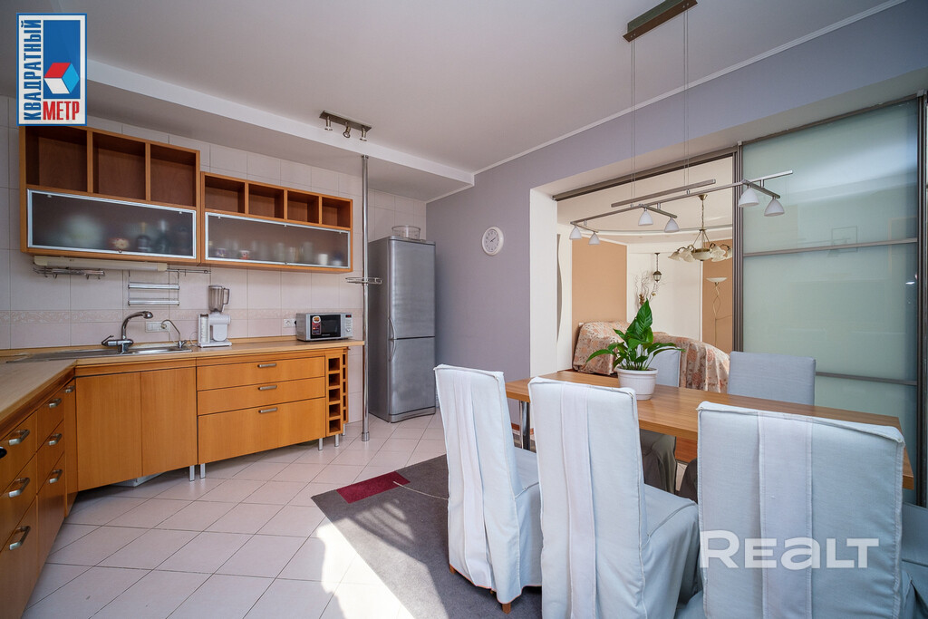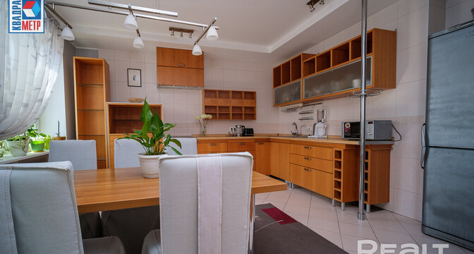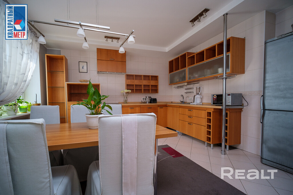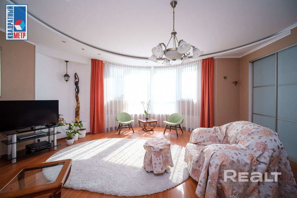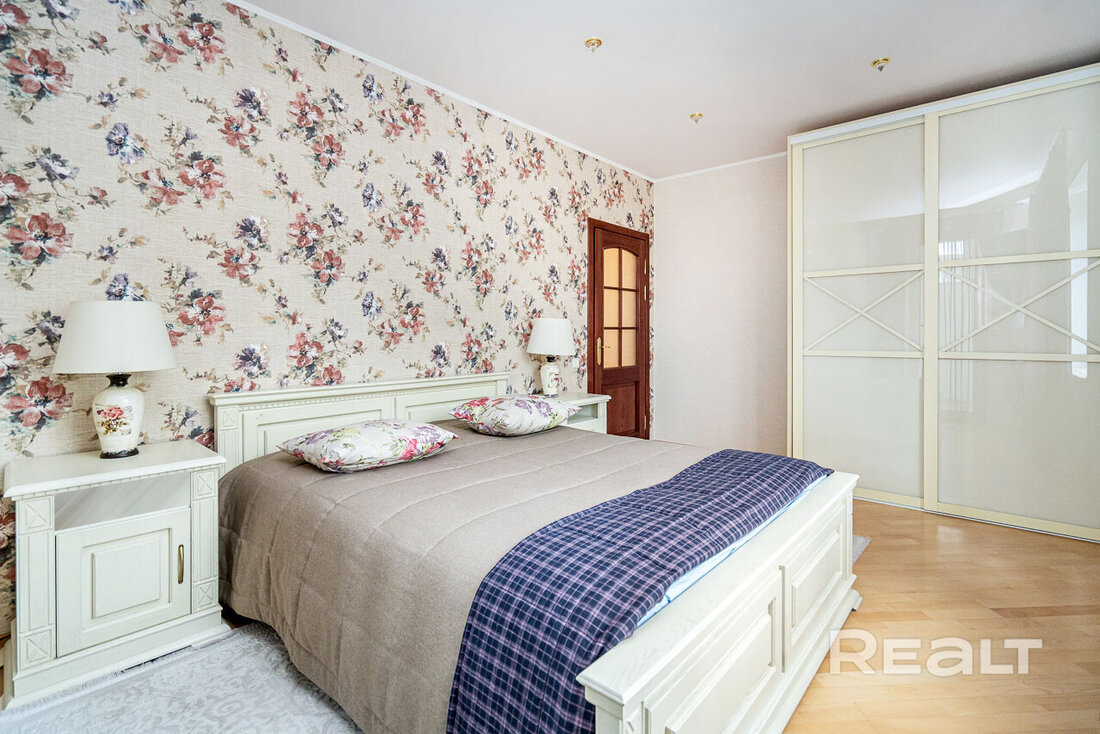 В квартире выполнен классический ремонт из качественных материалов: напольная плитка из Италии и Испании, в комнатах — немецкий дубовый паркет, межкомнатные двери из натурального массива. В квартире — два санузла, гардеробная, теплые полы. Стоимость — 188,9 тысячи долларов (1593 доллара — за метр).