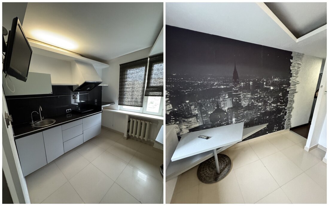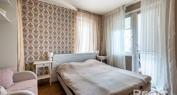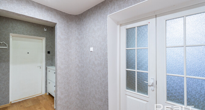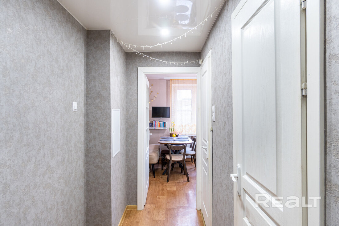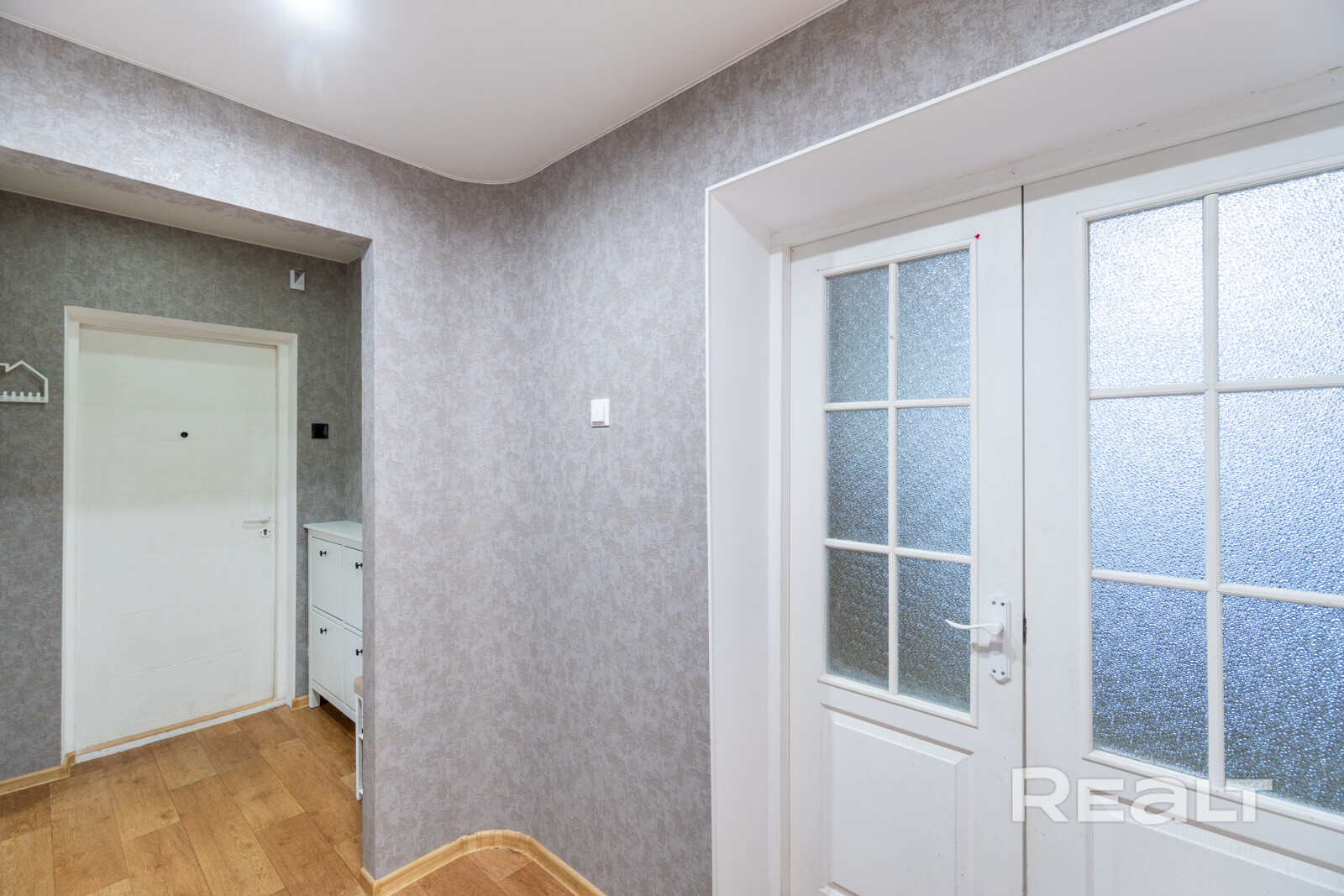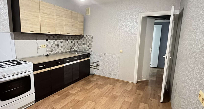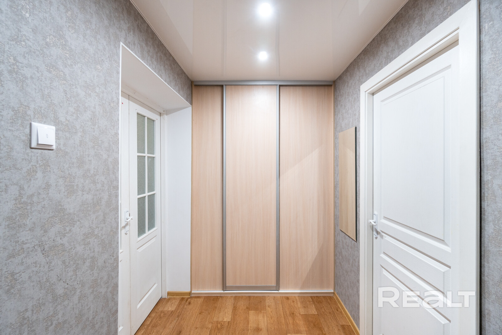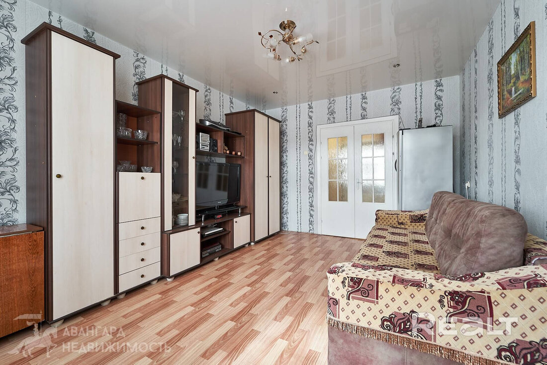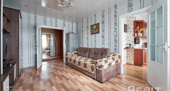 Квартира сама по себе аккуратная: в окнах стоят деревянные стеклопакеты, на полу лежит линолеум, в санузлах — плитка, тены оклеены обоями, сделаны натяжные потолки. В двушке остается встроенная кухня с техникой, два встроенных шкафа в коридоре. Комнаты изолированы, но одной есть выход в кухню.