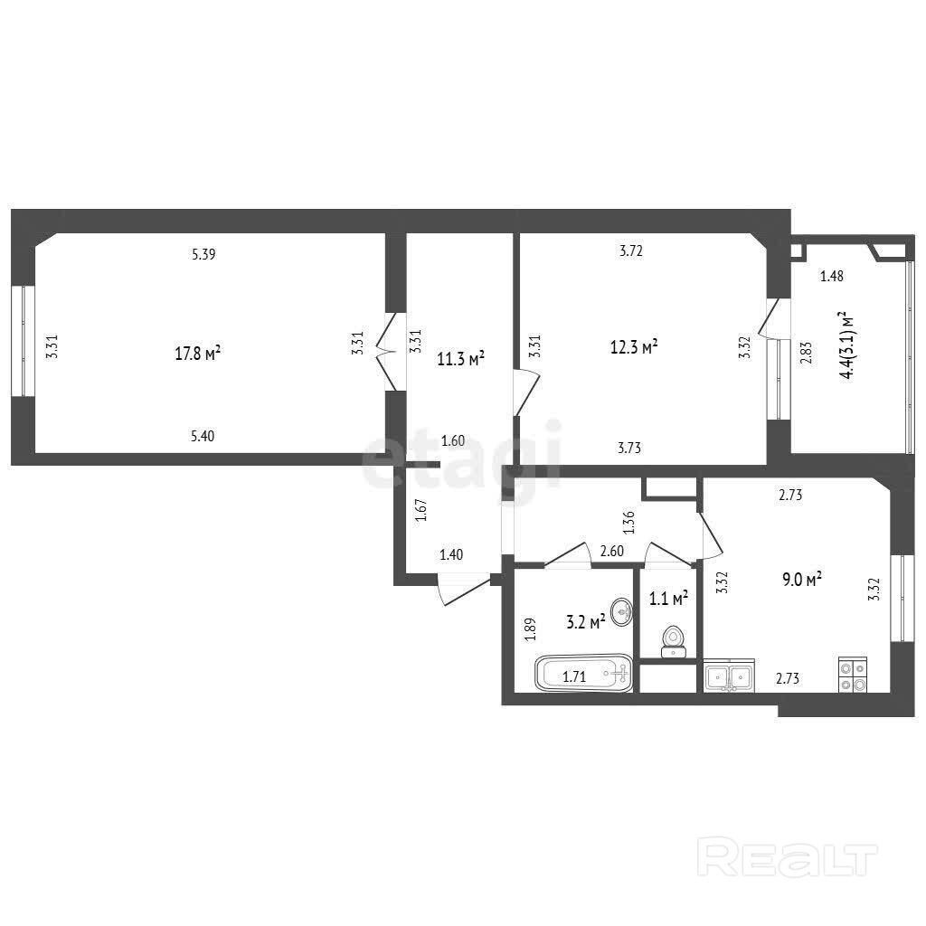 Санузел здесь раздельный. Из крайней комнаты есть выход на лоджию.