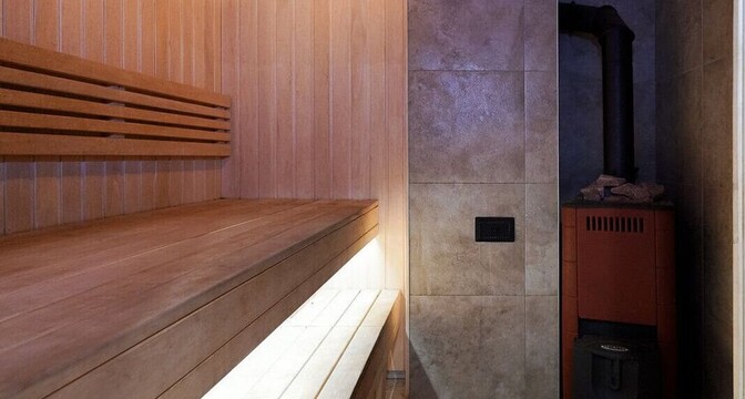 Планировка такая: общее двухсветное пространство кухни-гостиной с домашним кинотеатром, джакузи и инфракрасной сауной, санузел, топочная. Спальня оборудована на антресольном этаже.