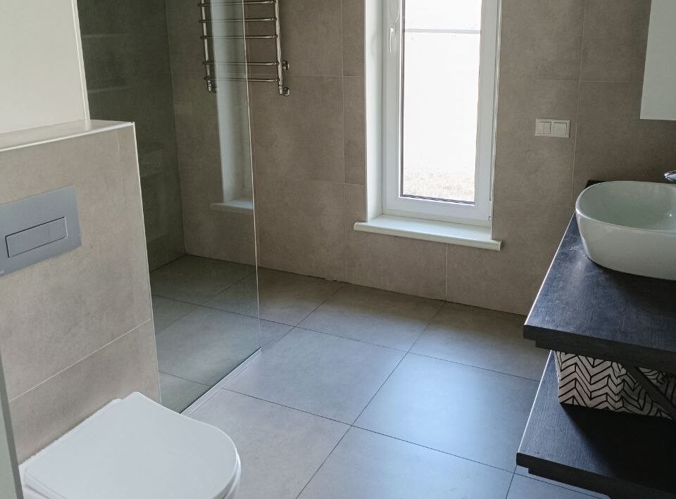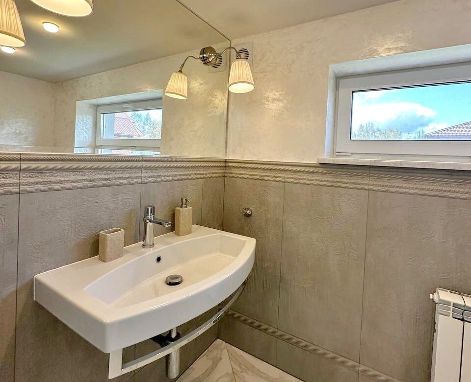 Дом здесь новый, построен в 2024 году из блоков (толщина 50 см). Фасад оштукатурен и покрашен, на крыше модульная металлочерепица. Это довольно объемное строение в два уровня, с автонавесом на два автомобиля и террасой. Общая площадь – 180 квадратов.