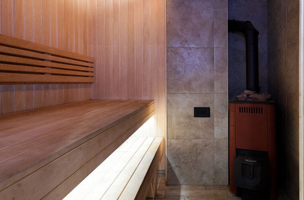 Площадь дома составляет 120 квадратов: три спальни, кухня, гостиная и баня с комнатой отдыха.