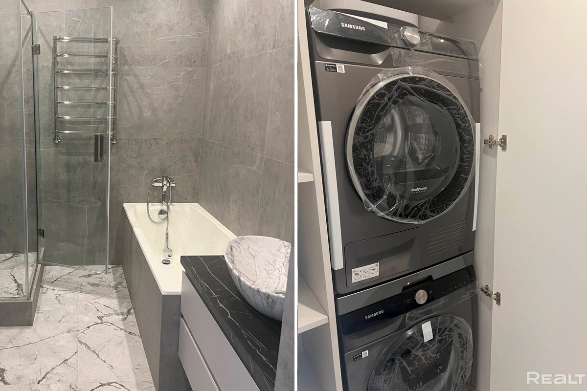 В совмещенном санузле установлены и ванна, и душевая. Есть стиральная и сушильная машины.