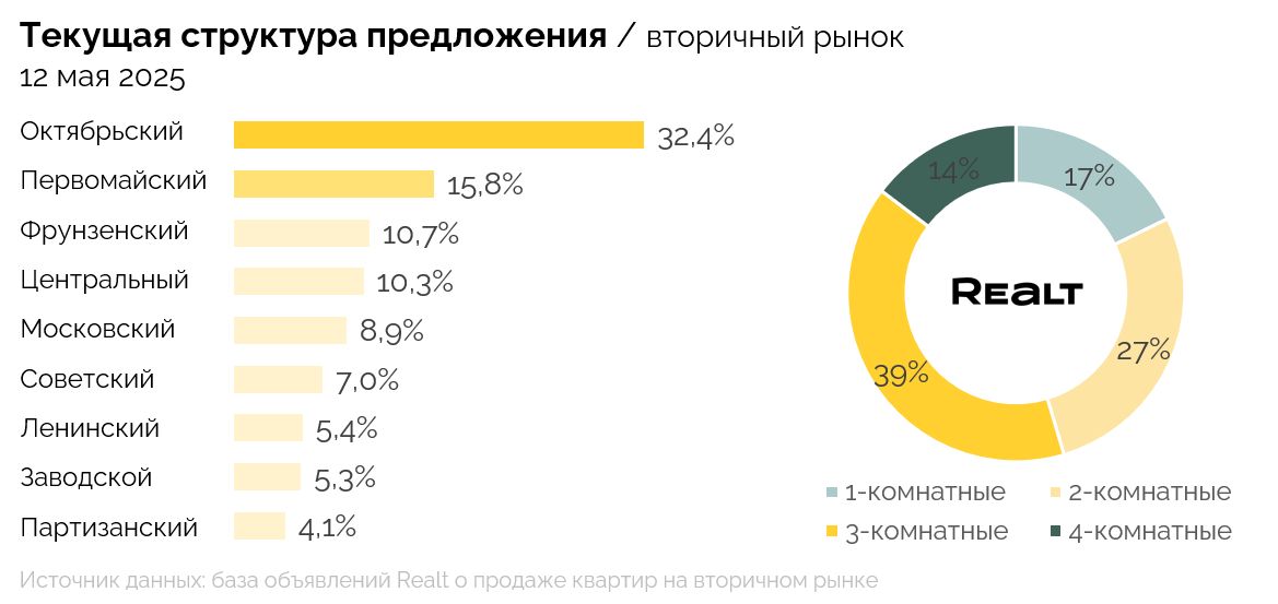 Если смотреть динамику предложения по районам города, то снижение числа объявлений произошло только в одном — Советском (-1,3%). При этом существеннее всего предложение выросло в Центральном районе — плюс 2%.