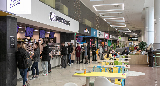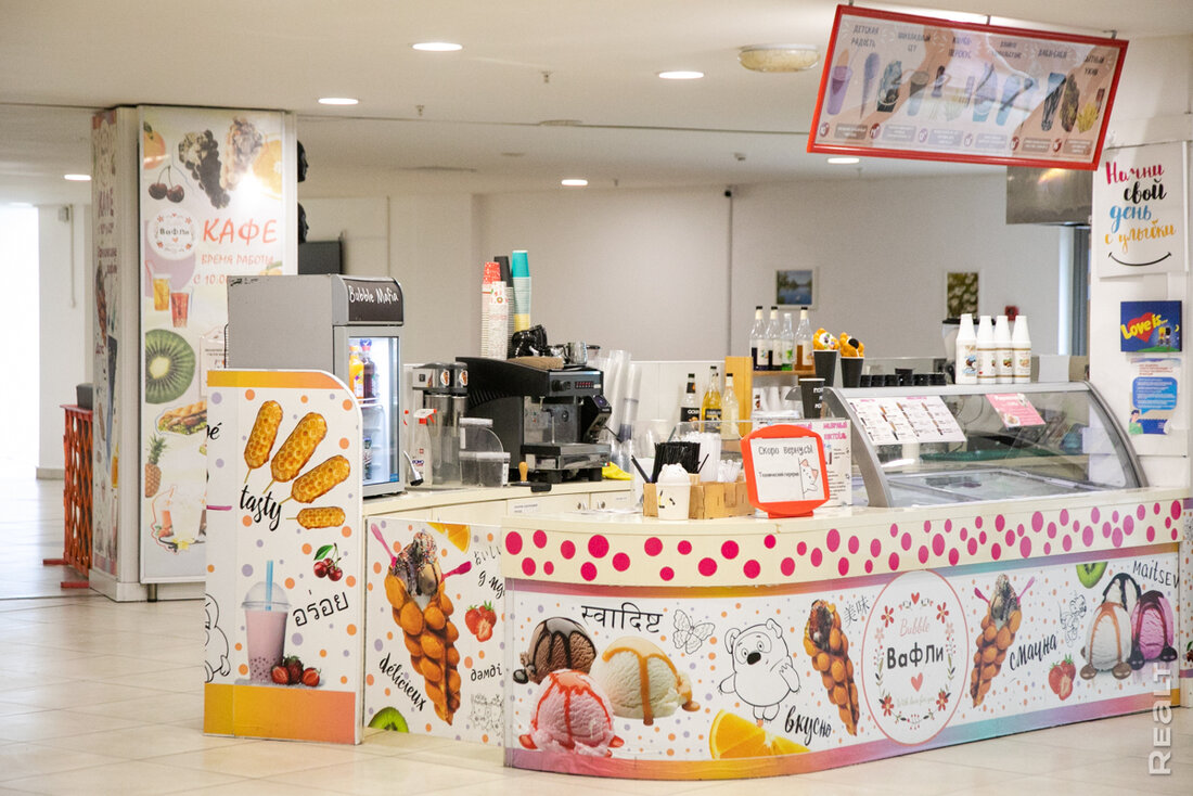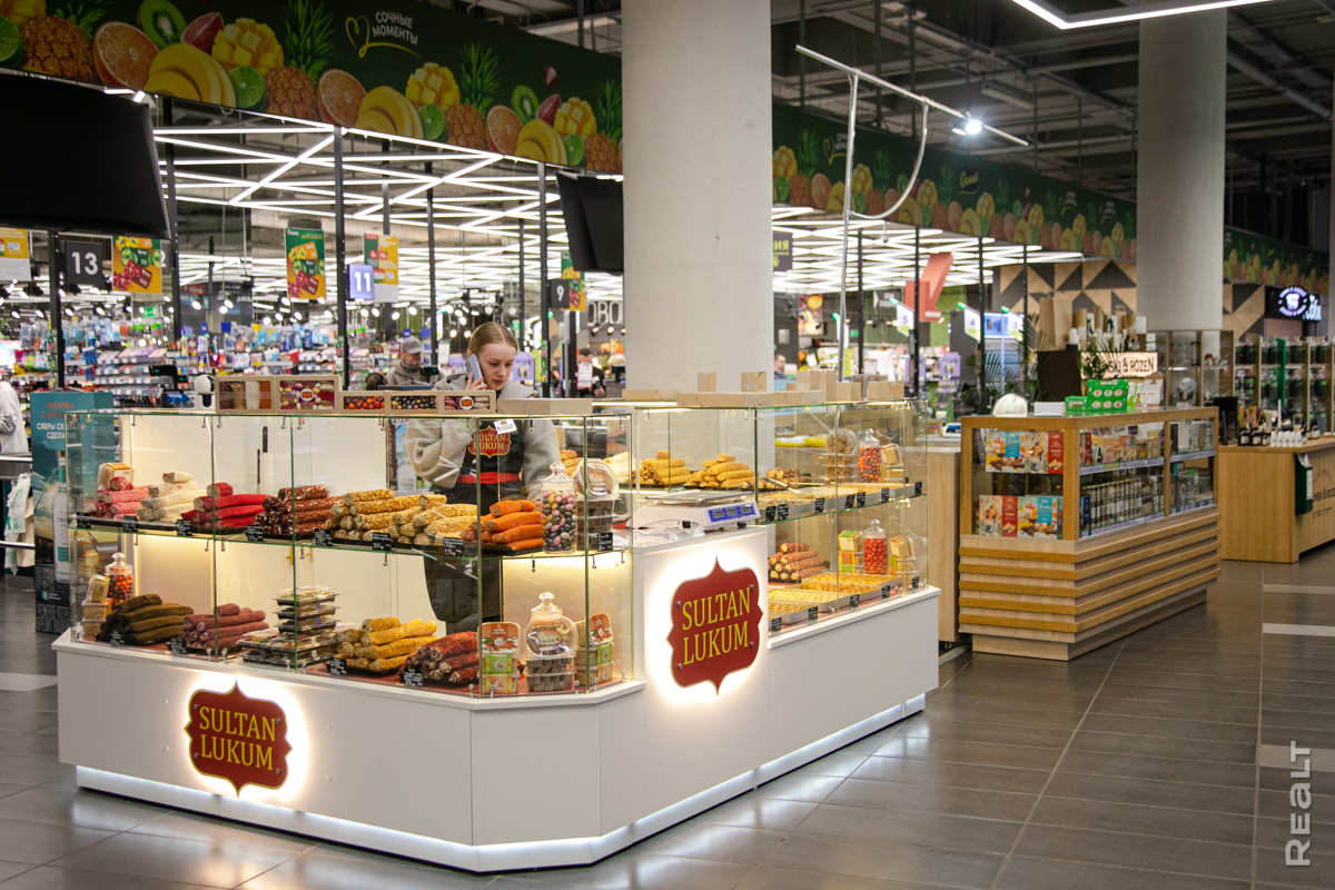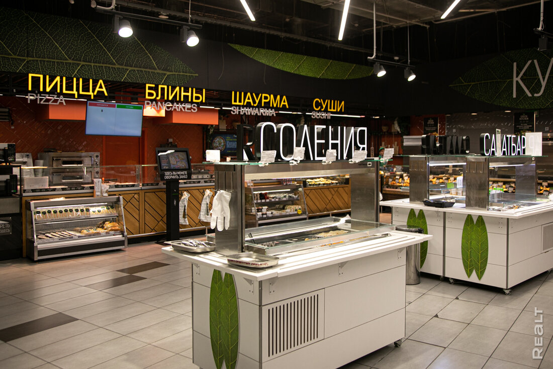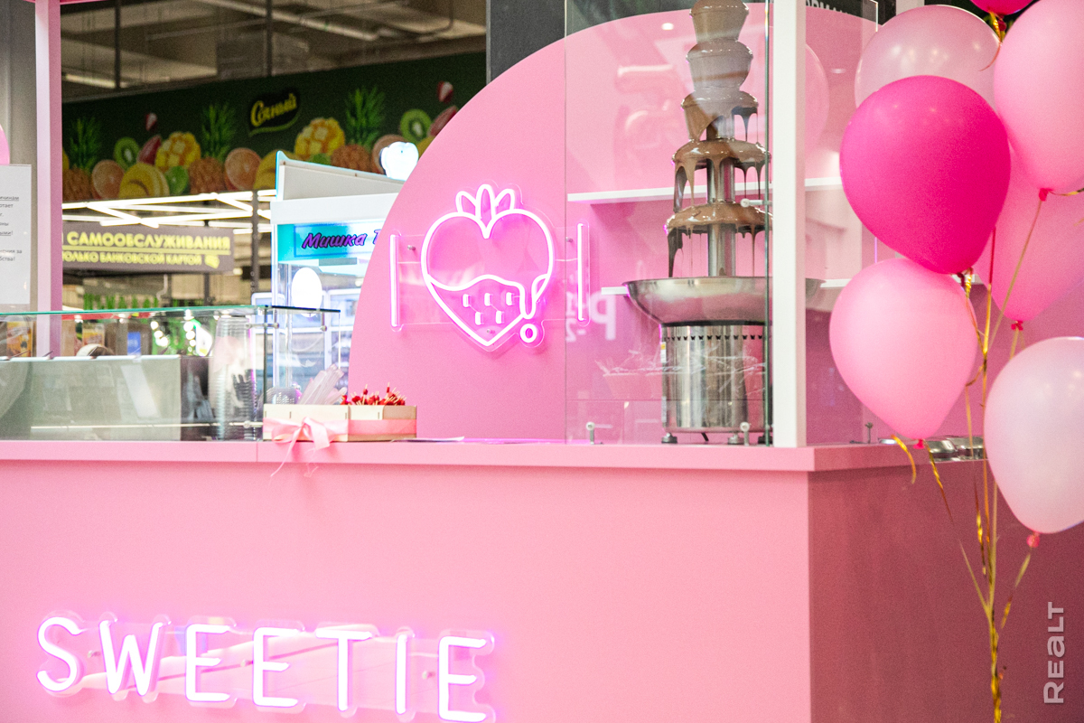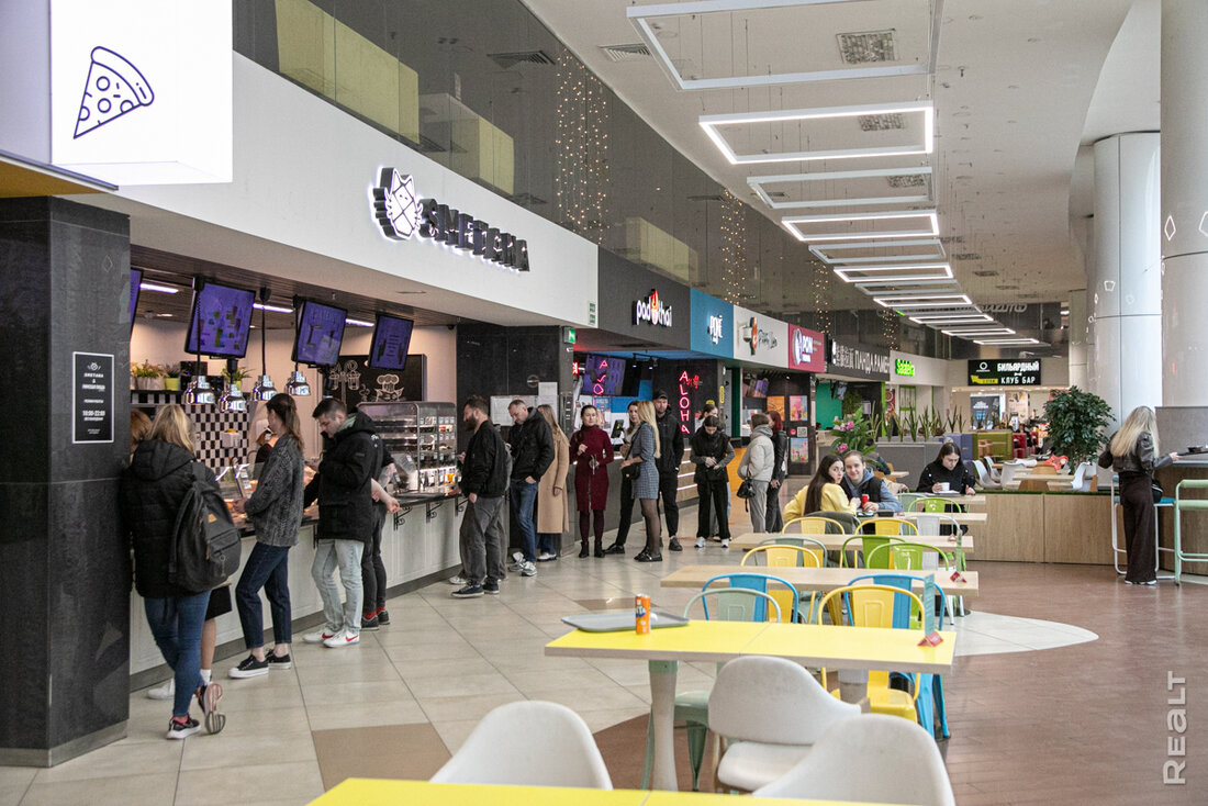 Рядом с гипермаркетом компактная гастрозона. Здесь кстати случилось гастро-открытие последних недель — точка SWEETIE с клубникой в шоколаде. Пока такого больше нигде в Минске не встретишь: десерт готовят прямо при тебе.