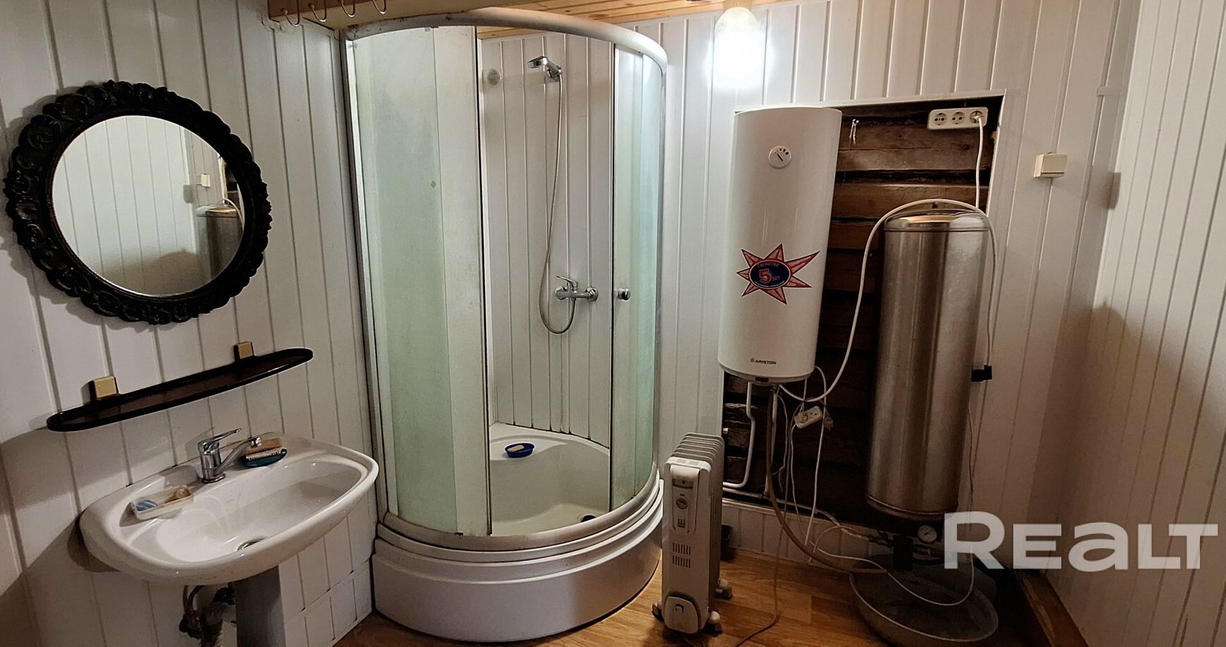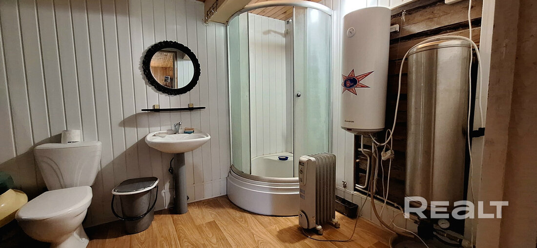 Нашлось место и для полноценного санузла с душевой кабиной, туалетом. Вода подается в дом насосом из колодца, нагревается в бойлере. Канализация местная.