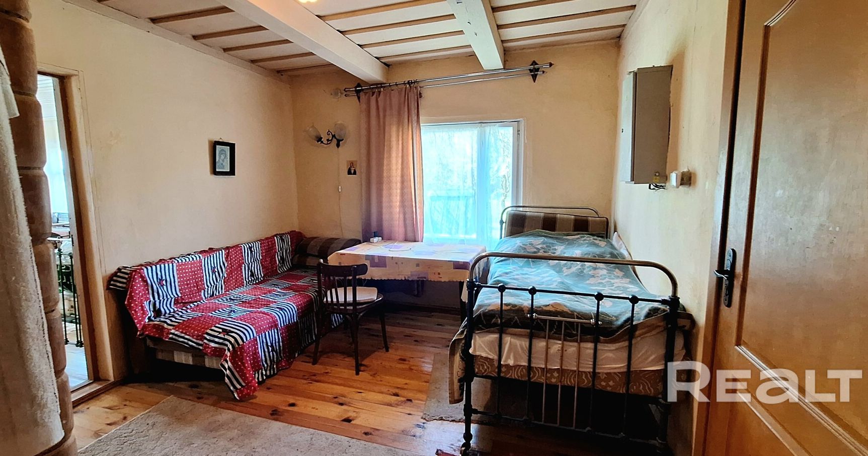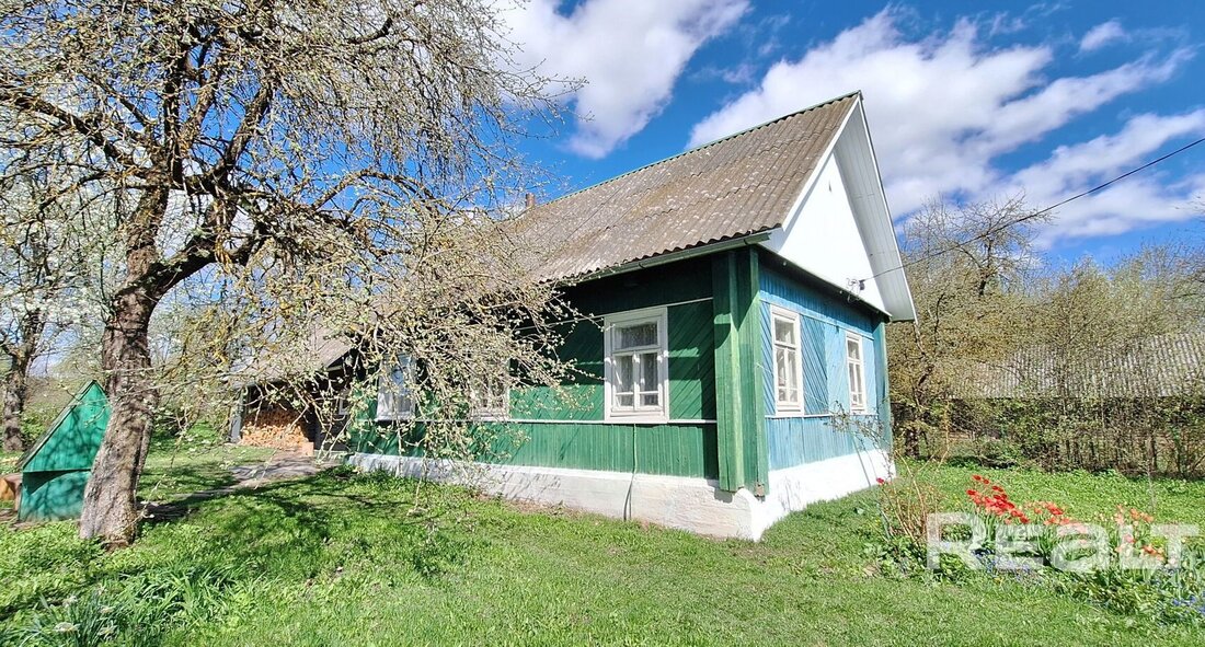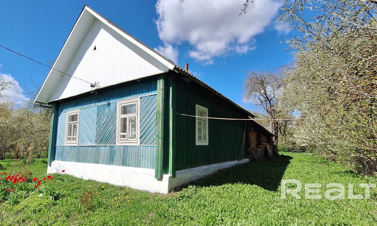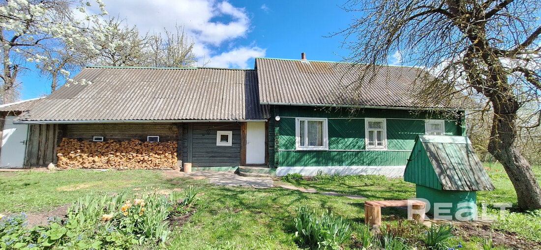 Здесь в продаже появился дом 1990 года постройки. По виду это классическая деревянная хата с хозяйственной частью под одной шиферной крышей. Фундамент бетонный, высокий, фасад ошалеван, окна в деревянных рамах. Внешне состояние нормальное, вопросов не вызывает.