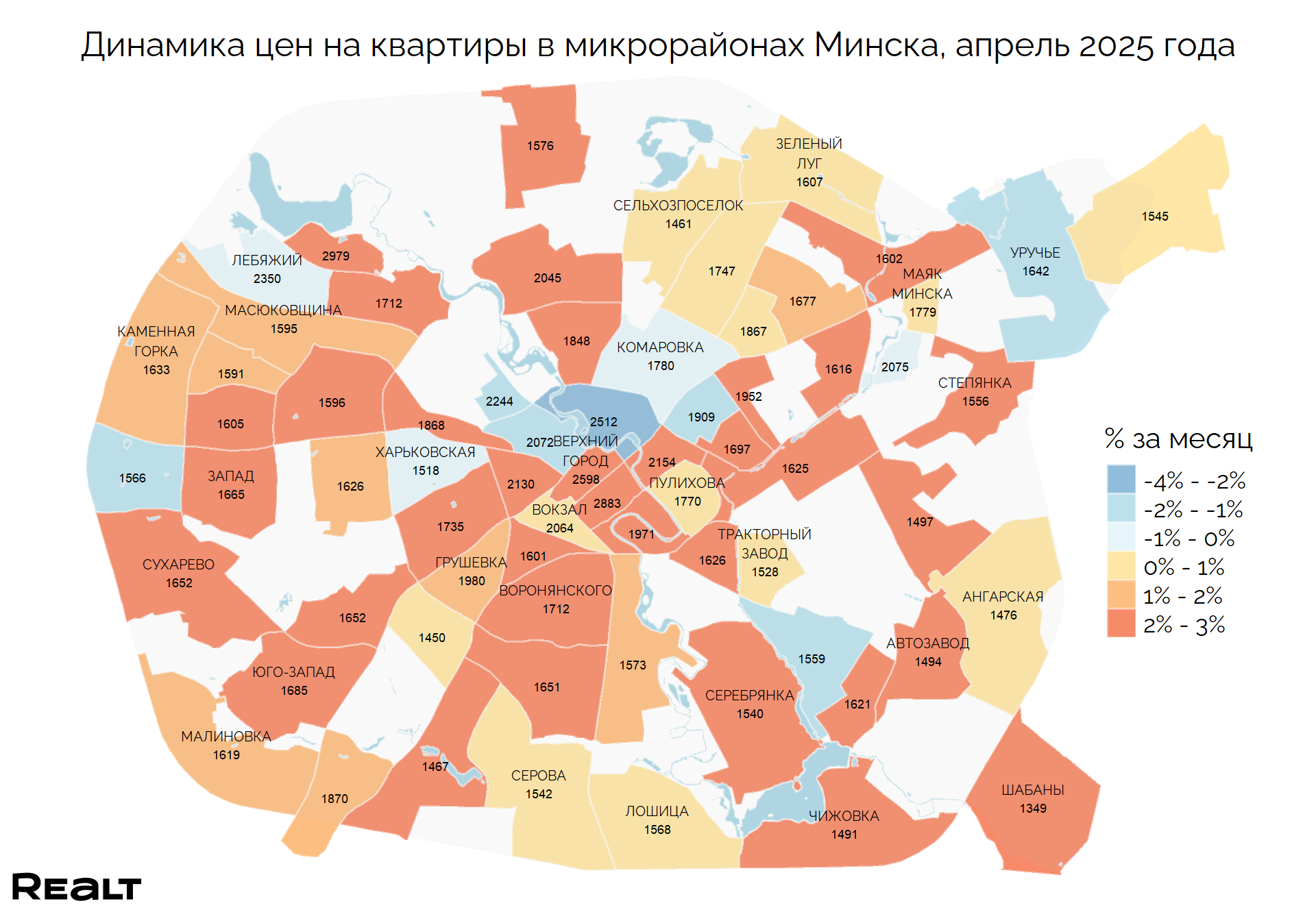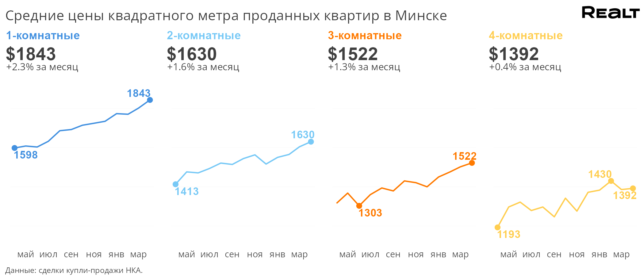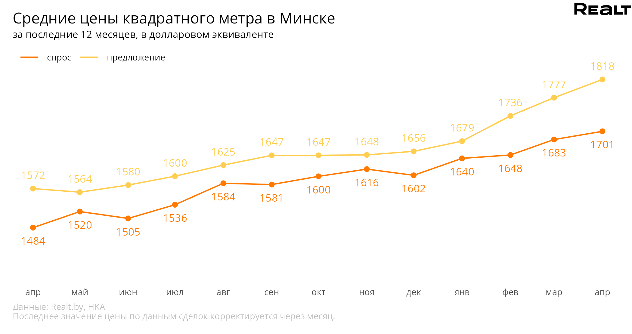 Средняя стоимость квадратного метра в Минске впервые с 2014 года превысила уровень в 1700 долларов: за апрель она составила 1701 доллар за квадратный метр, что на 1.1% больше, чем в прошлом месяце. Существеннее всего подорожали однушки, прибавив 2.3% к стоимости.