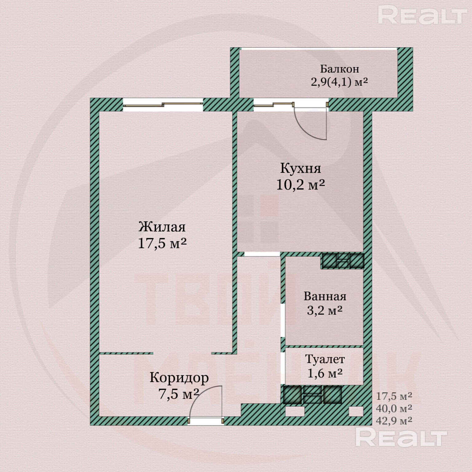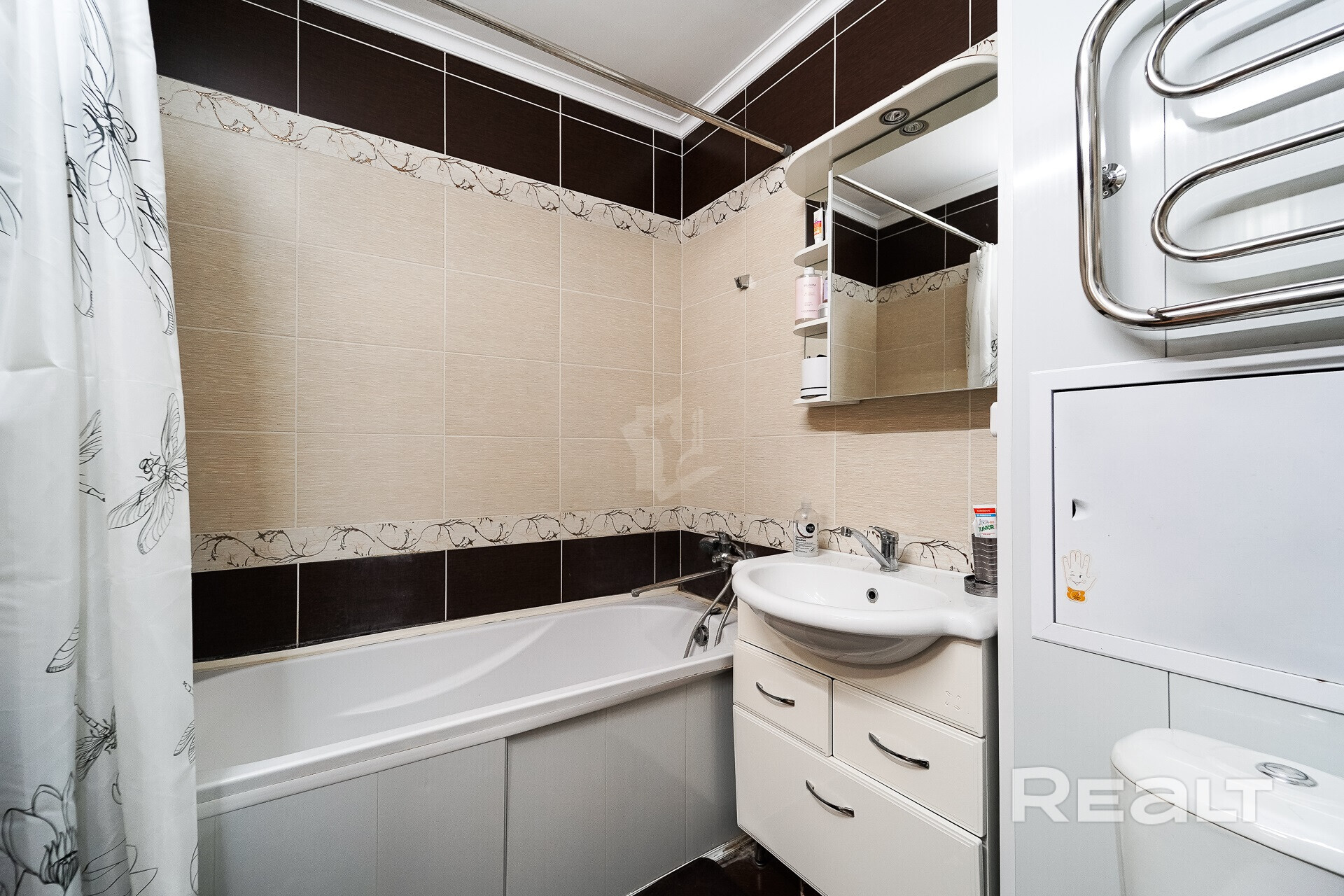 Общая площадь — 29 квадратов. У входа установлен большой шкаф-купе. Есть застекленная лоджия. В совмещенном санузле установлена ванна, подключена стиральная машина.